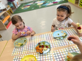 Następnie przeszliśmy do części praktycznej – przygotowywania owocowych szaszłyków. Dzieci samodzielnie wybierały ulubione owoce, takie jak banany, truskawki, winogrona, kiwi czy jabłka, a następnie nabijały je na patyczki, tworząc kolorowe i apetyczne kompozycje. Była to świetna okazja do rozmowy o zdrowym odżywianiu i znaczeniu owoców w codziennej diecie.