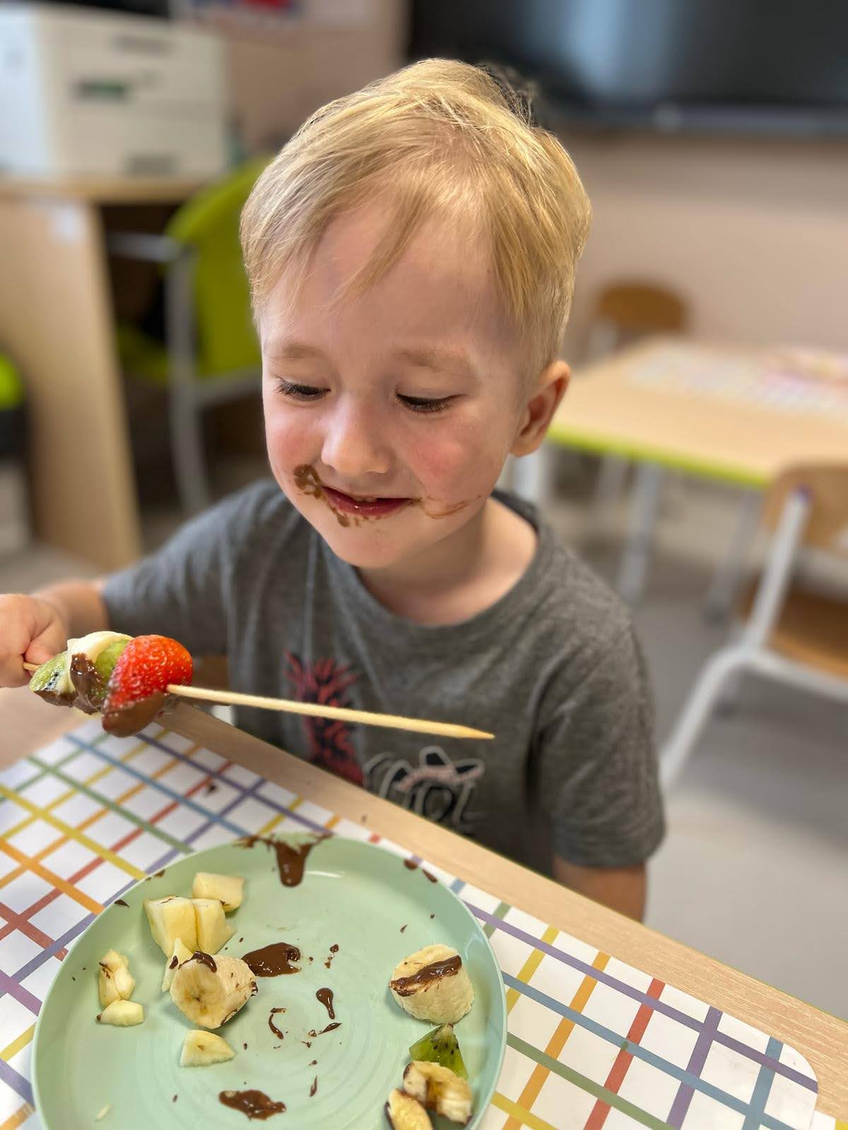Kulminacyjnym punktem dnia była fontanna z czekolady, w której dzieci mogły zanurzać przygotowane wcześniej szaszłyki. Radości i uśmiechów było co niemiara! Dzieci z wielką radością obserwowały płynącą czekoladę, a następnie kosztowały swoich czekoladowych przysmaków.