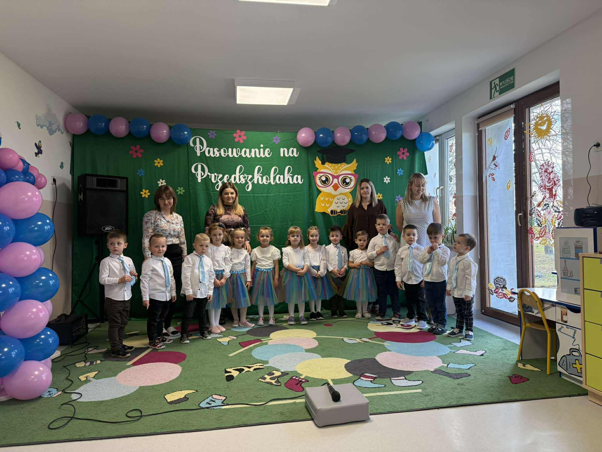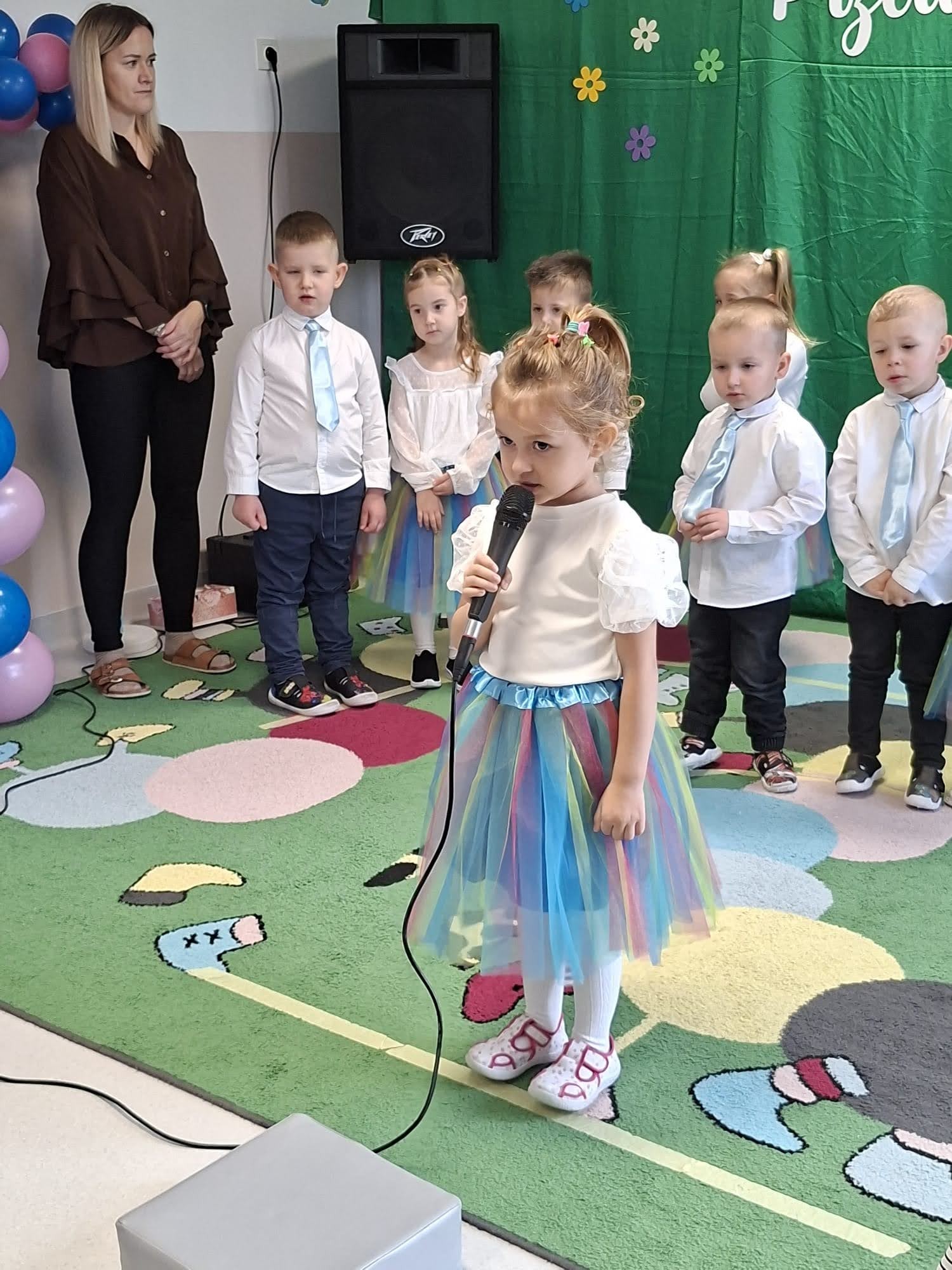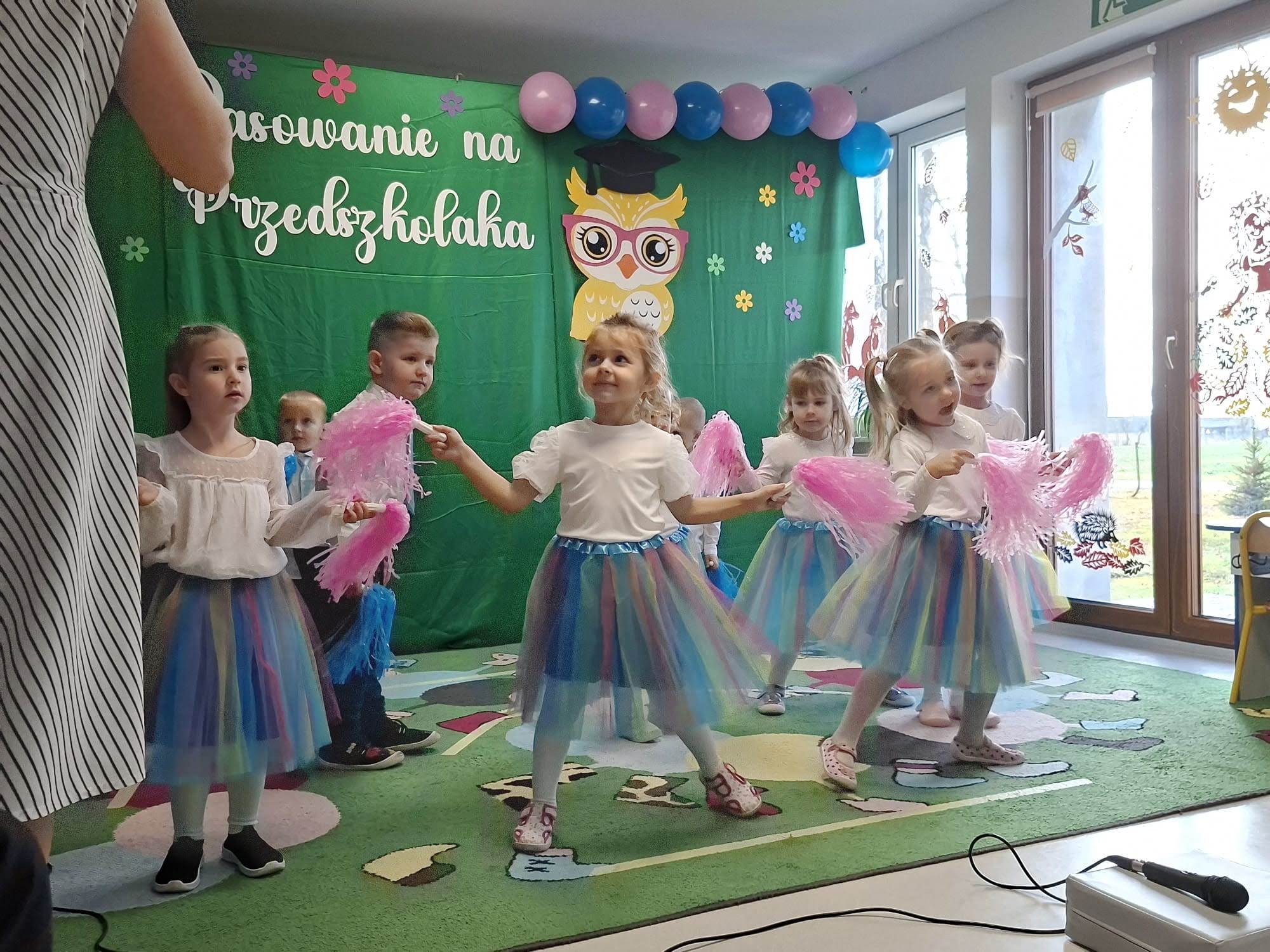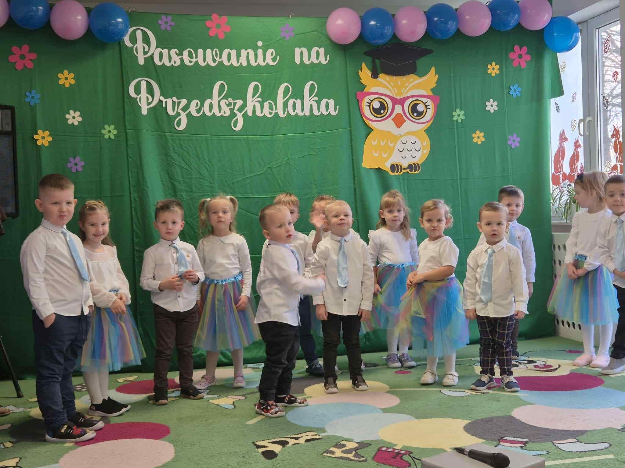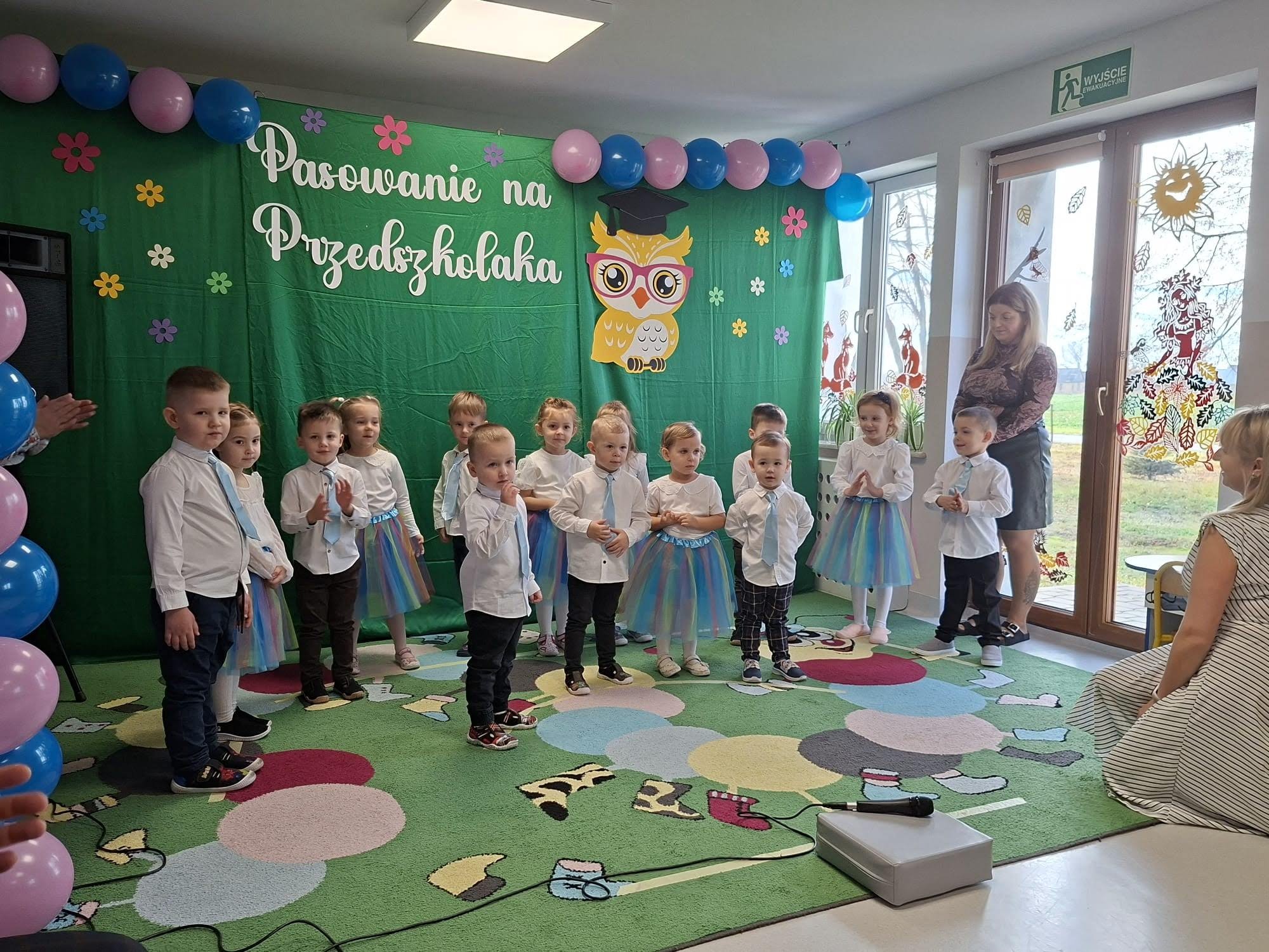 Podczas występu dzieci zaprezentowały różnorodne umiejętności. Recytowały poznane wierszyki, śpiewały piosenki oraz grały na instrumentach muzycznych. W programie artystycznym znalazły się również układy taneczne – dzieci tańczyły z kolorowymi pomponami oraz przy użyciu gumy sensorycznej, co wywołało uśmiechy na twarzach rodziców. Po części artystycznej Pani Dyrektor dokonała symbolicznego aktu pasowania każdego dziecka na przedszkolaka. Przedszkolaki otrzymały pamiątkowe dyplomy, prezenciki oraz gratulacje. Rodzice przygotowali słodki poczęstunek, który był miłym zakończeniem uroczystości i stworzył okazję do wspólnego świętowania.Wydarzenie przebiegło w ciepłej i uroczystej atmosferze, a dla dzieci było pierwszym ważnym przeżyciem w społeczności przedszkolnej.