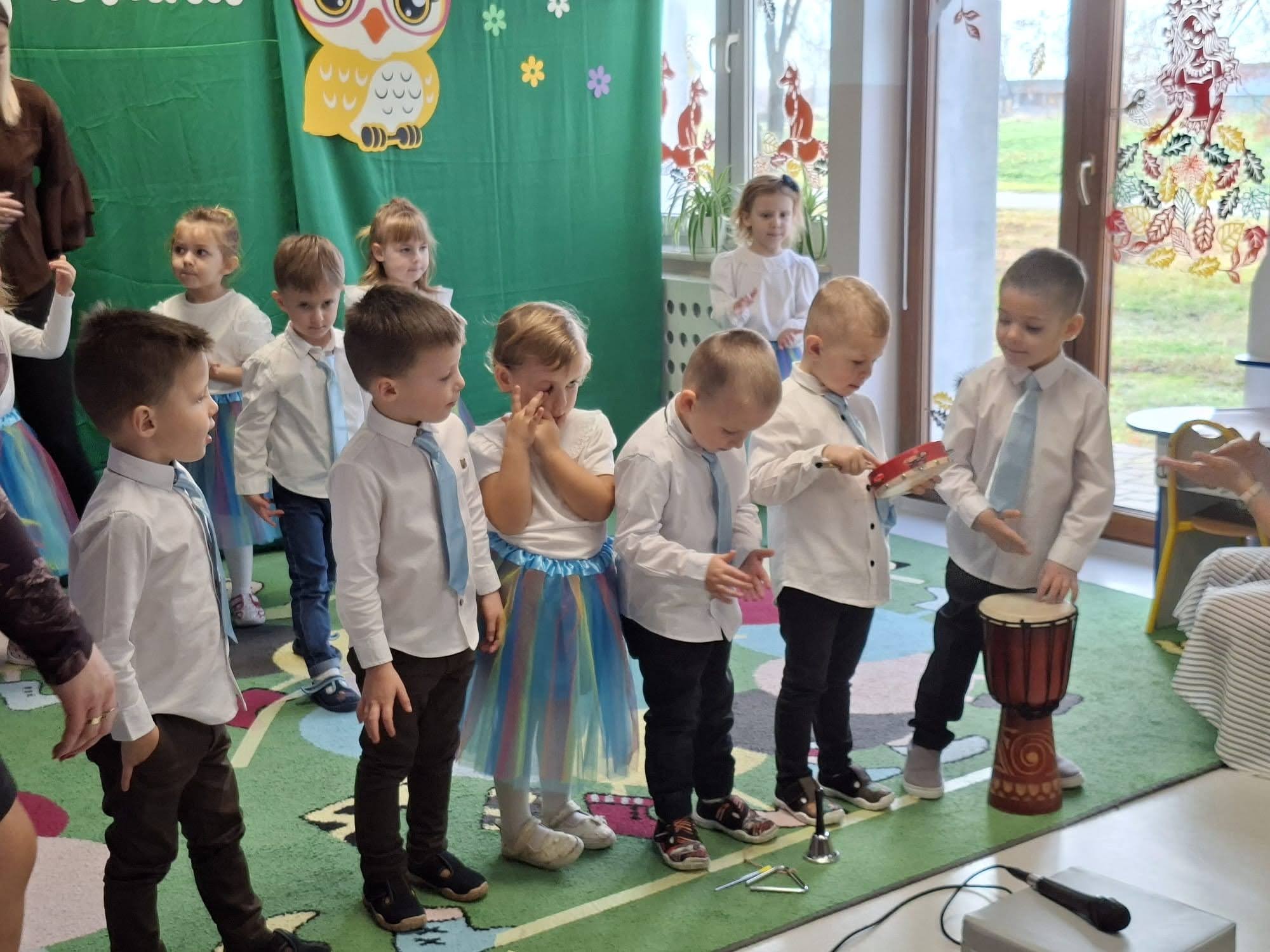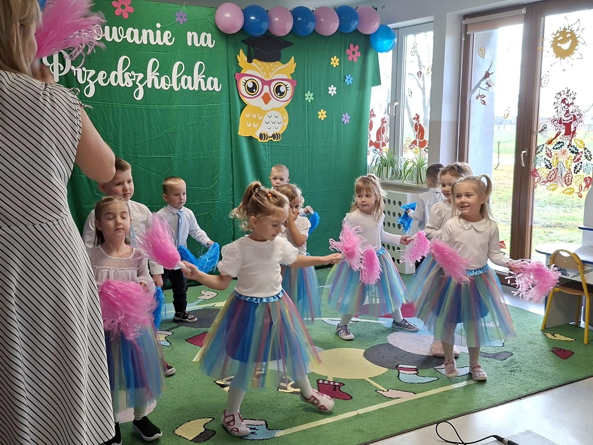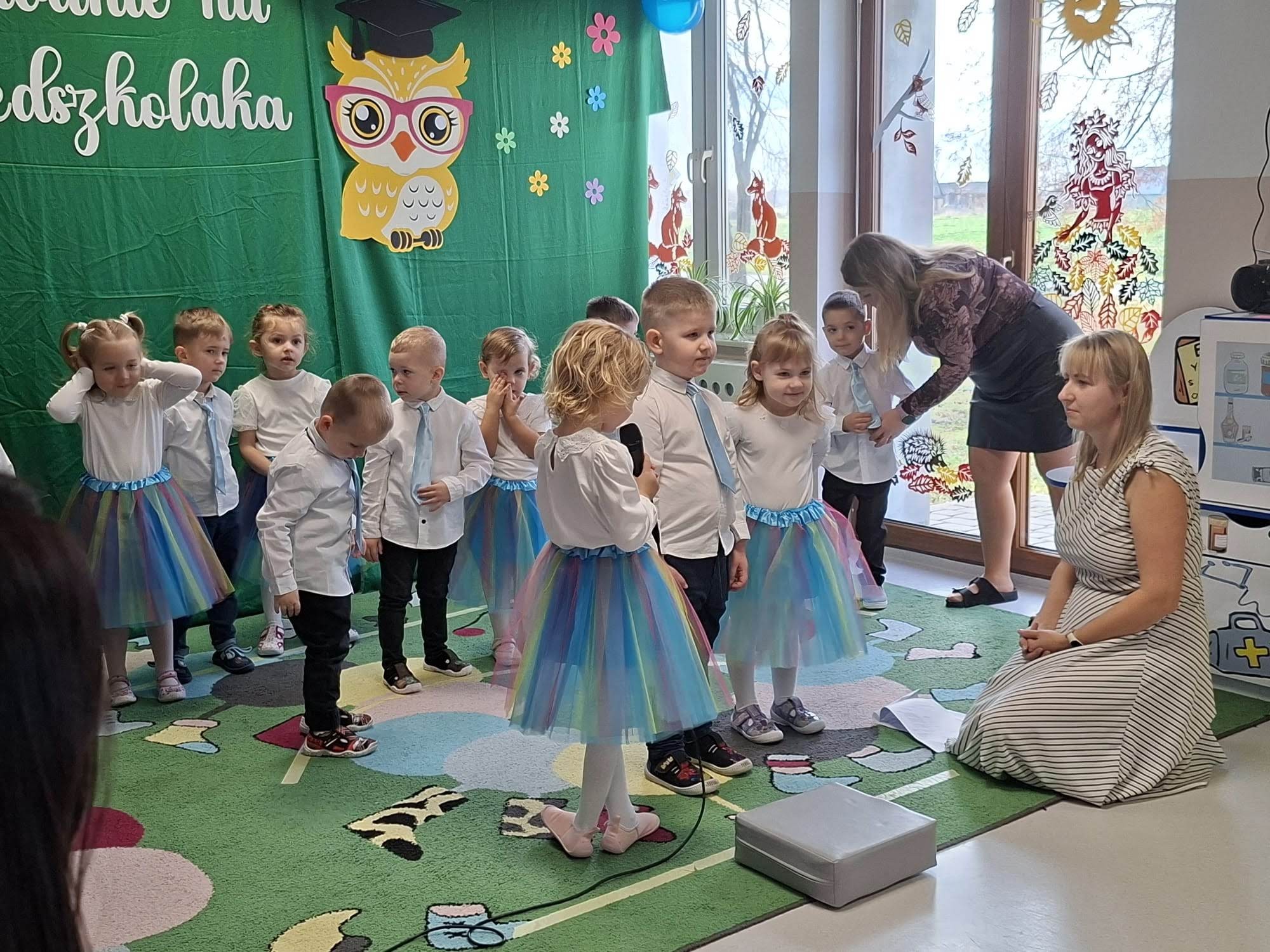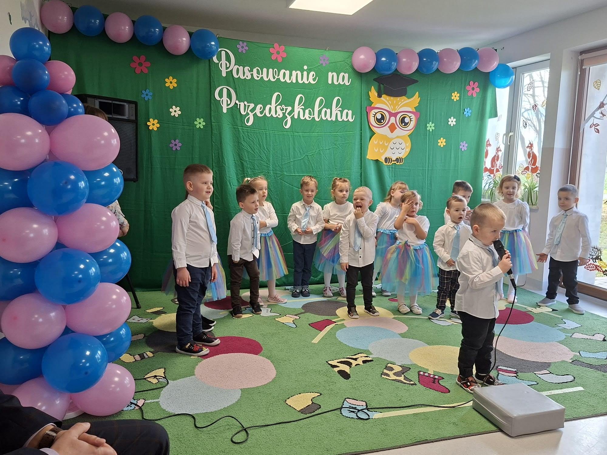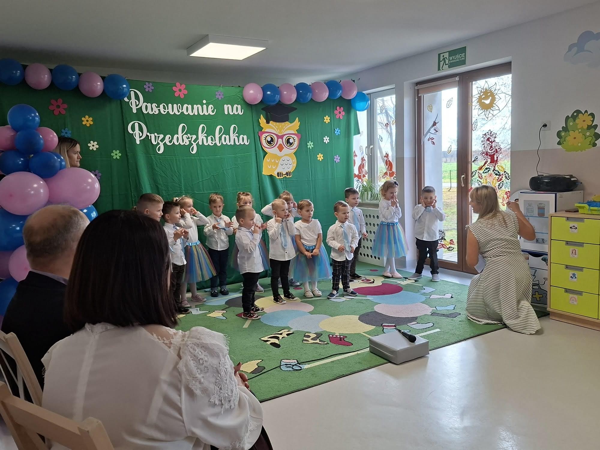 Podczas występu dzieci zaprezentowały różnorodne umiejętności. Recytowały poznane wierszyki, śpiewały piosenki oraz grały na instrumentach muzycznych. W programie artystycznym znalazły się również układy taneczne – dzieci tańczyły z kolorowymi pomponami oraz przy użyciu gumy sensorycznej, co wywołało uśmiechy na twarzach rodziców. Po części artystycznej Pani Dyrektor dokonała symbolicznego aktu pasowania każdego dziecka na przedszkolaka. Przedszkolaki otrzymały pamiątkowe dyplomy, prezenciki oraz gratulacje. Rodzice przygotowali słodki poczęstunek, który był miłym zakończeniem uroczystości i stworzył okazję do wspólnego świętowania.Wydarzenie przebiegło w ciepłej i uroczystej atmosferze, a dla dzieci było pierwszym ważnym przeżyciem w społeczności przedszkolnej.