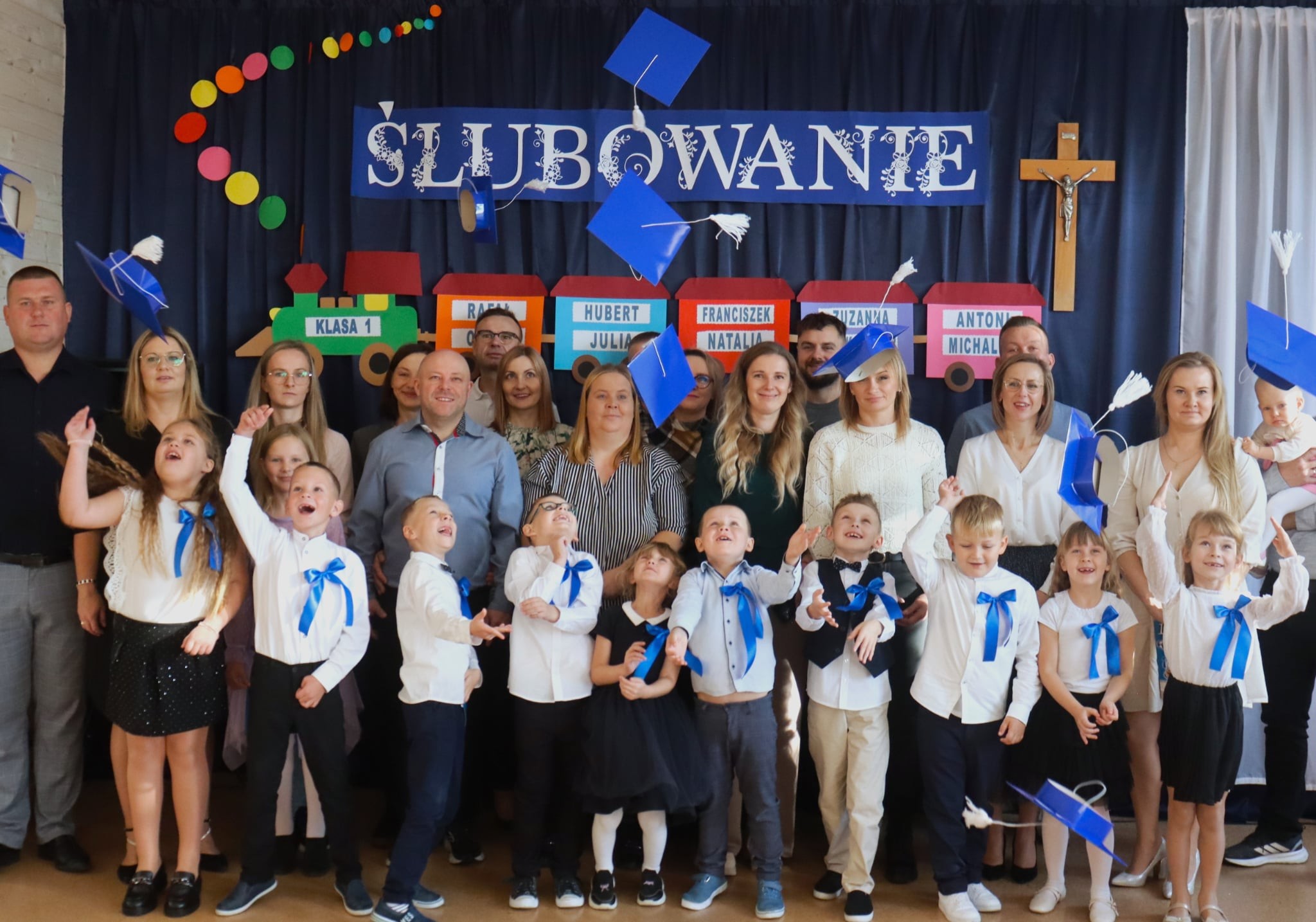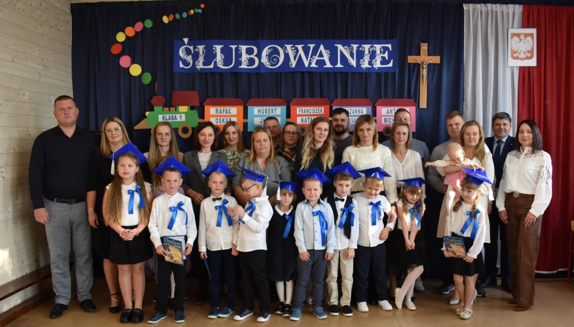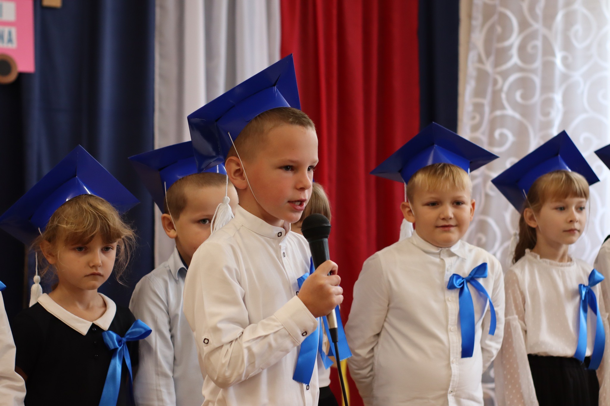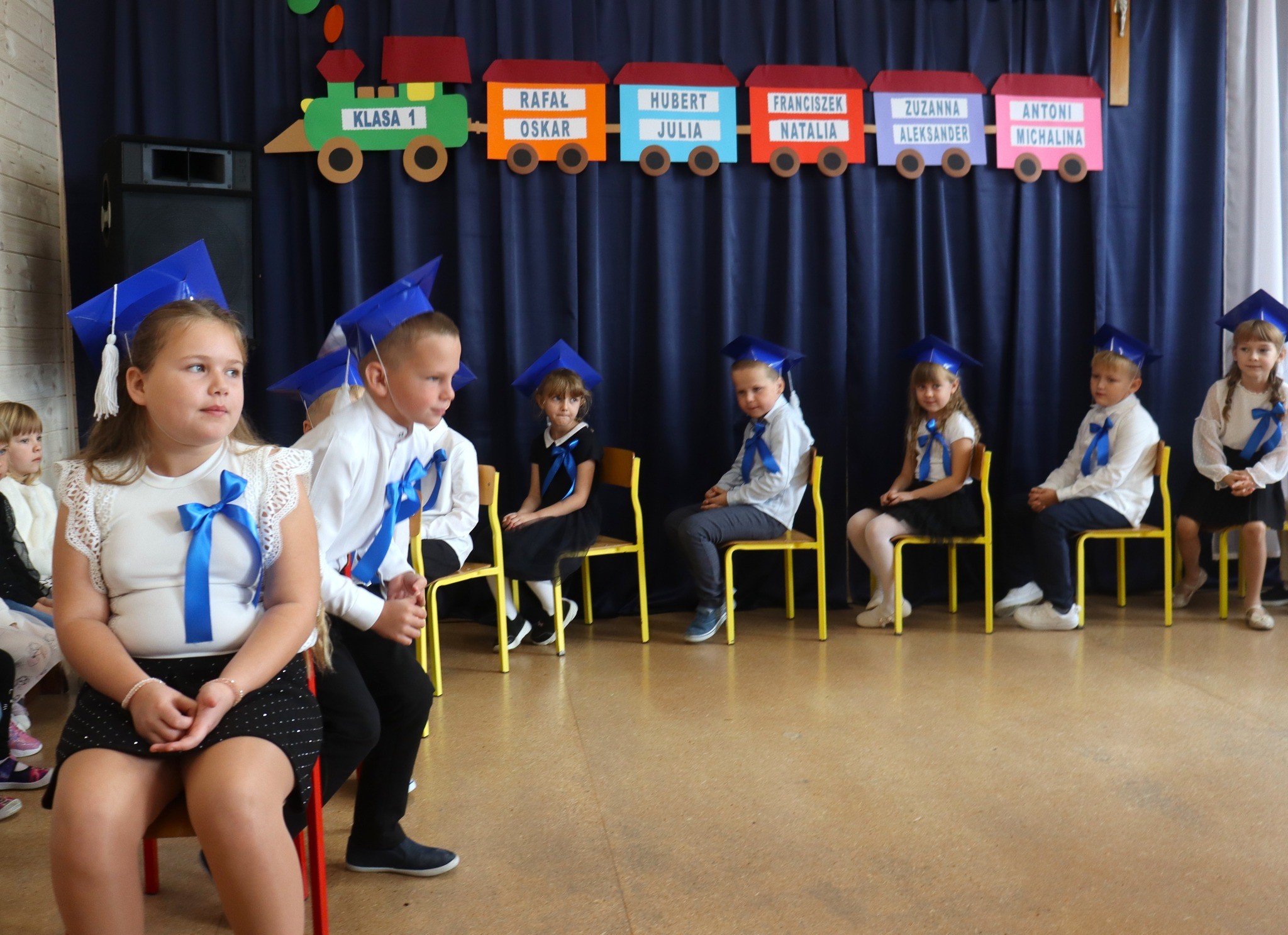 przyjęte w poczet uczniów szkoły. Tegoroczna uroczystość przebiegała pod hasłem „Podróż do nauki”. Pierwszoklasiści z entuzjazmem prezentowali kolejne stacje swojej podróży, odwiedzając m.in.: stację edukacji polonistycznej, matematycznej, przyrodniczej czy muzycznej i plastycznej. Całość przedstawienia była barwna, pełna radości i dziecięcego zaangażowania. Każdy uczeń miał możliwość zaprezentowania swoich umiejętności. Po części artystycznej nastąpił uroczysty akt ślubowania, a następnie pasowanie na ucznia dokonane przez panią Dyrektor. Dzieci otrzymały pamiątkowe dyplomy i drobne upominki przygotowane przez starszych kolegów, a także przez pana wójta. Uroczystość zakończyła się wspólnym poczęstunkiem i radosnymi rozmowami w klasie. Ten dzień z pewnością na długo pozostanie w pamięci wszystkich pierwszoklasistów i ich rodzin – jako symboliczny początek szkolnej przygody, która właśnie się rozpoczęła.