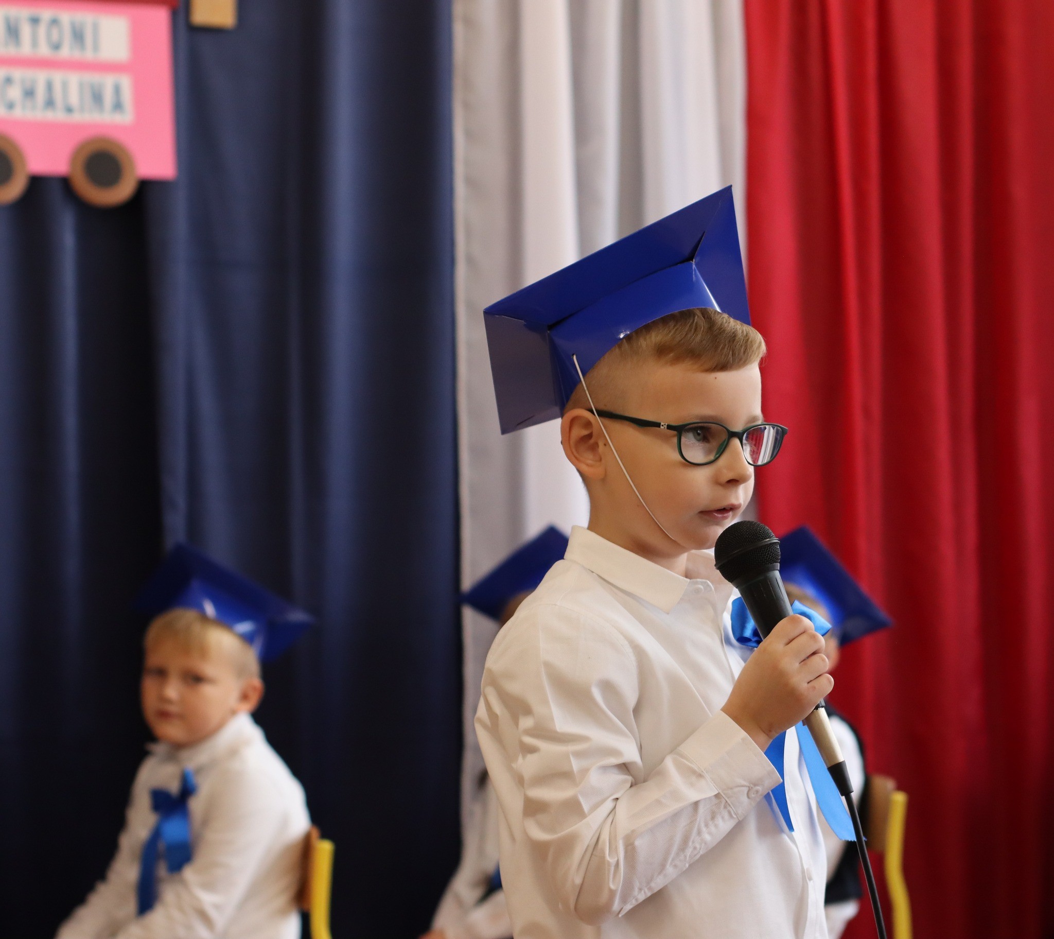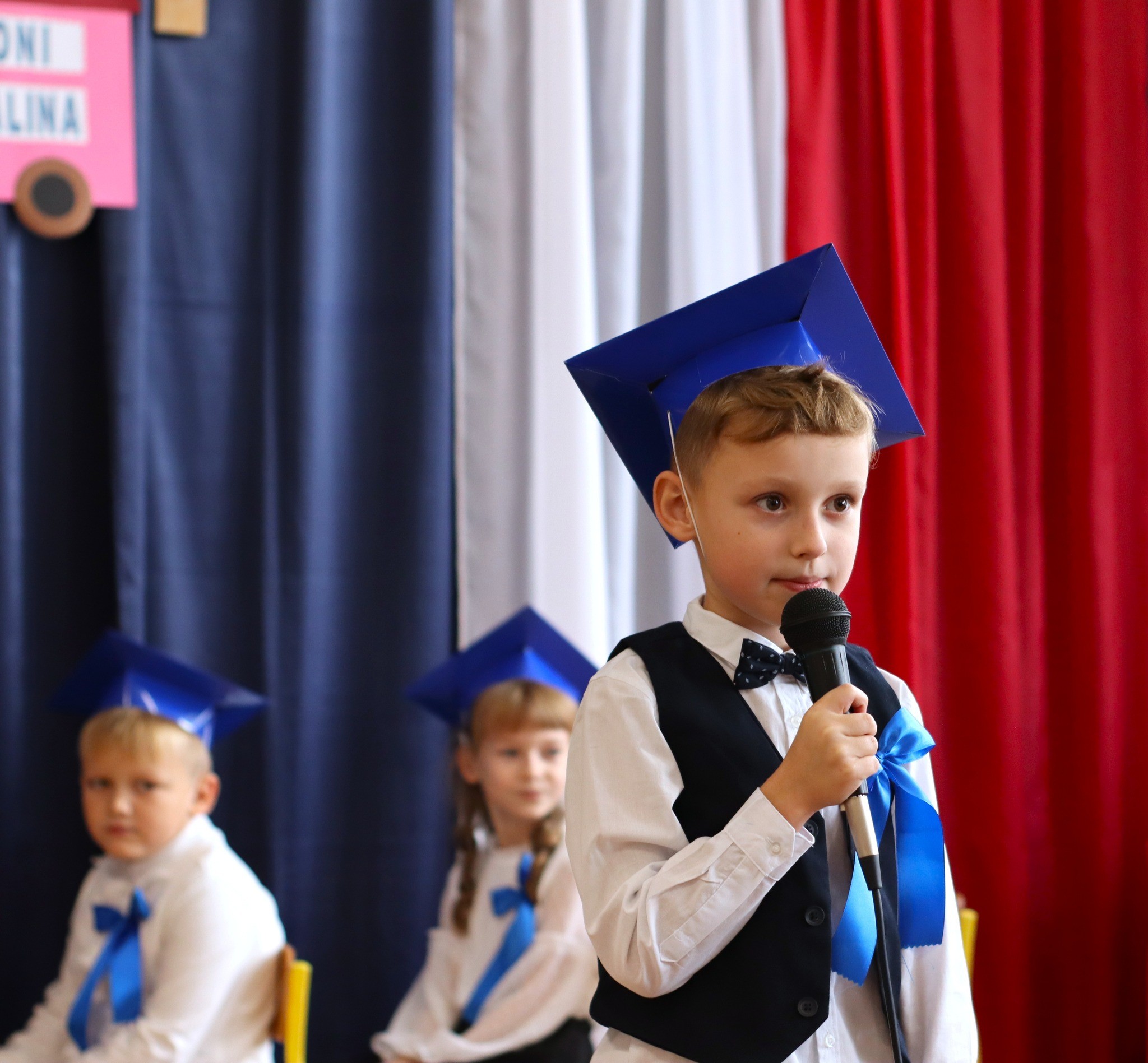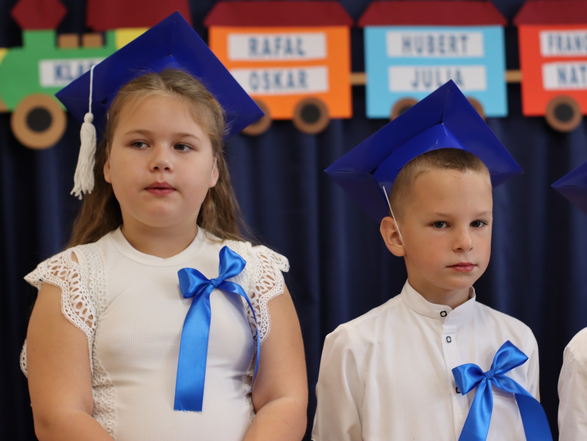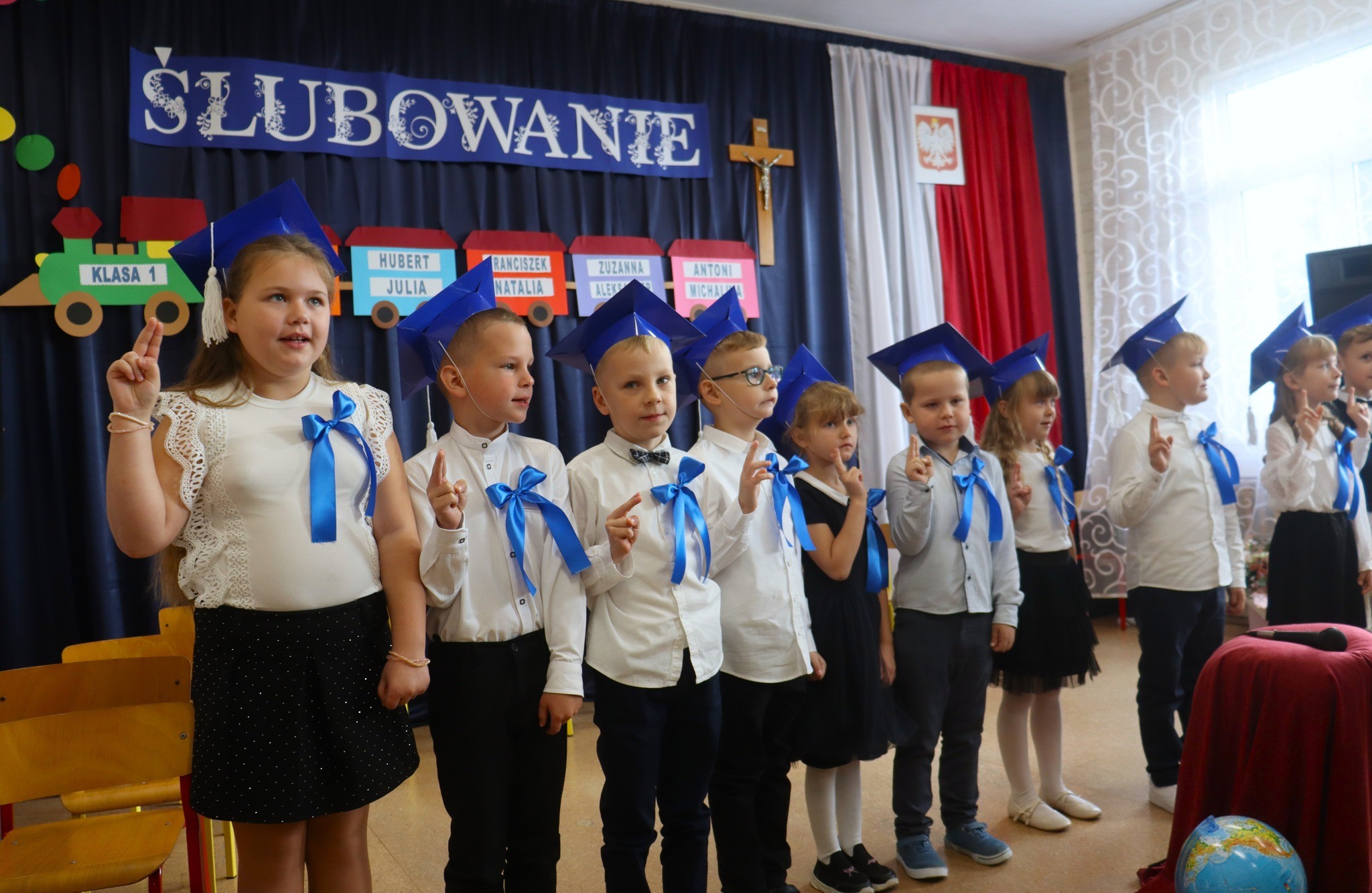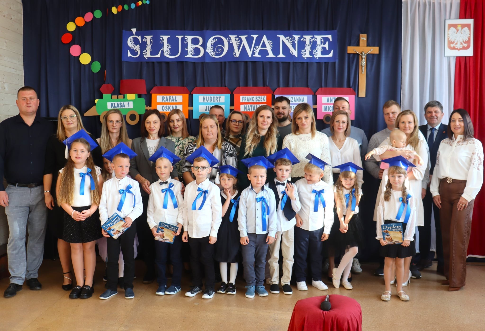 przyjęte w poczet uczniów szkoły. Tegoroczna uroczystość przebiegała pod hasłem „Podróż do nauki”. Pierwszoklasiści z entuzjazmem prezentowali kolejne stacje swojej podróży, odwiedzając m.in.: stację edukacji polonistycznej, matematycznej, przyrodniczej czy muzycznej i plastycznej. Całość przedstawienia była barwna, pełna radości i dziecięcego zaangażowania. Każdy uczeń miał możliwość zaprezentowania swoich umiejętności. Po części artystycznej nastąpił uroczysty akt ślubowania, a następnie pasowanie na ucznia dokonane przez panią Dyrektor. Dzieci otrzymały pamiątkowe dyplomy i drobne upominki przygotowane przez starszych kolegów, a także przez pana wójta. Uroczystość zakończyła się wspólnym poczęstunkiem i radosnymi rozmowami w klasie. Ten dzień z pewnością na długo pozostanie w pamięci wszystkich pierwszoklasistów i ich rodzin – jako symboliczny początek szkolnej przygody, która właśnie się rozpoczęła.