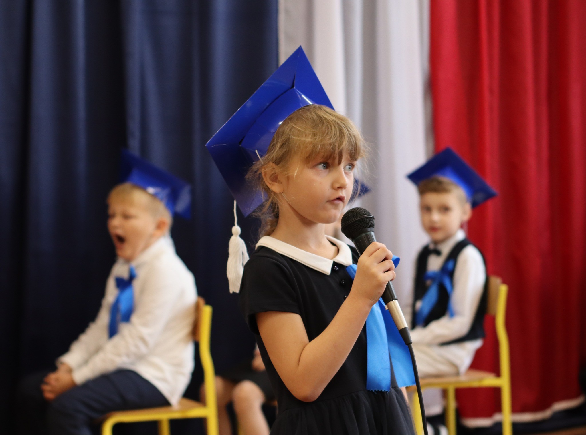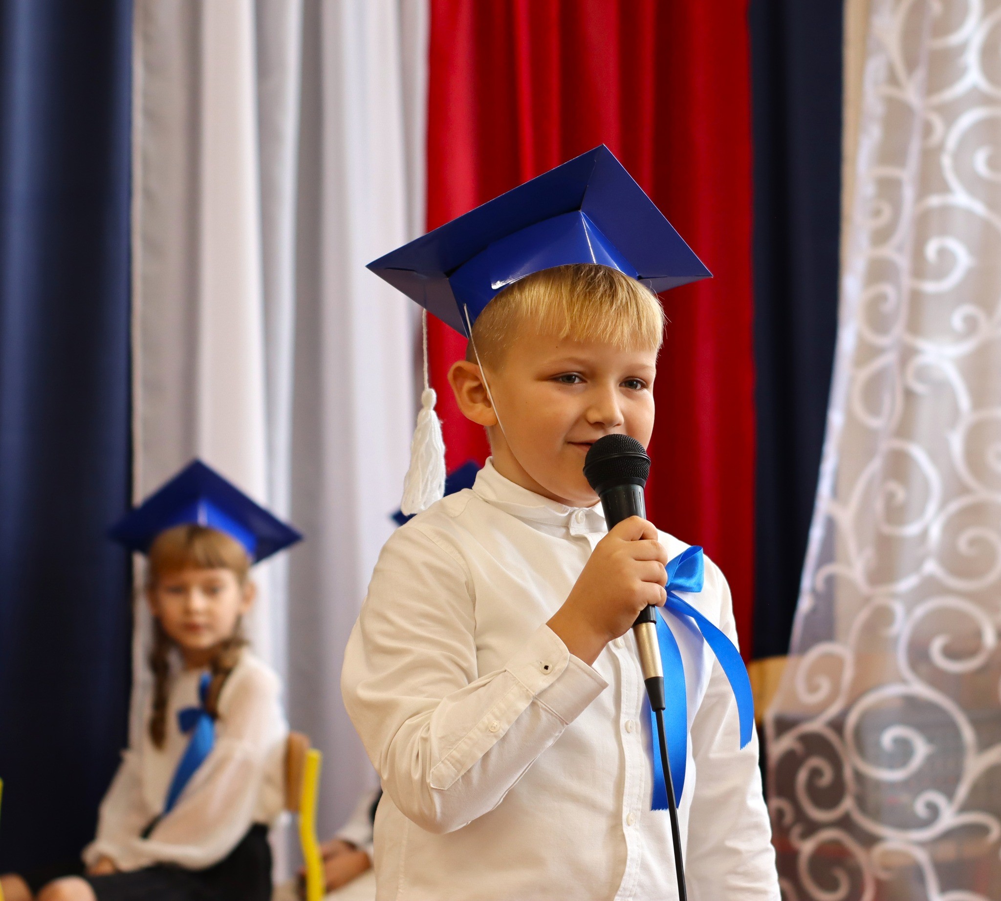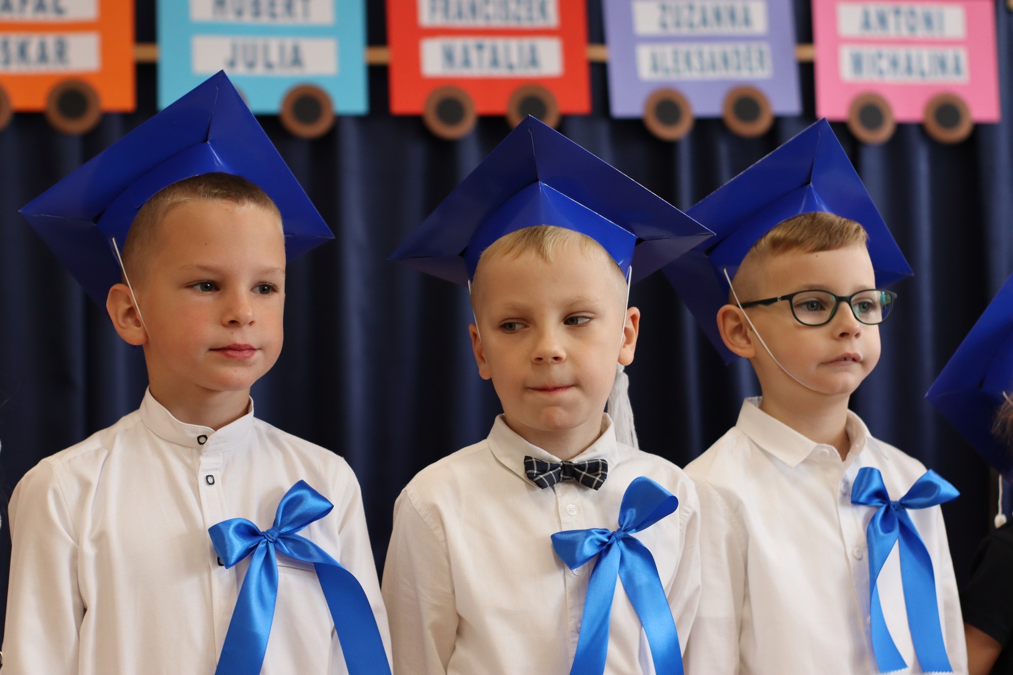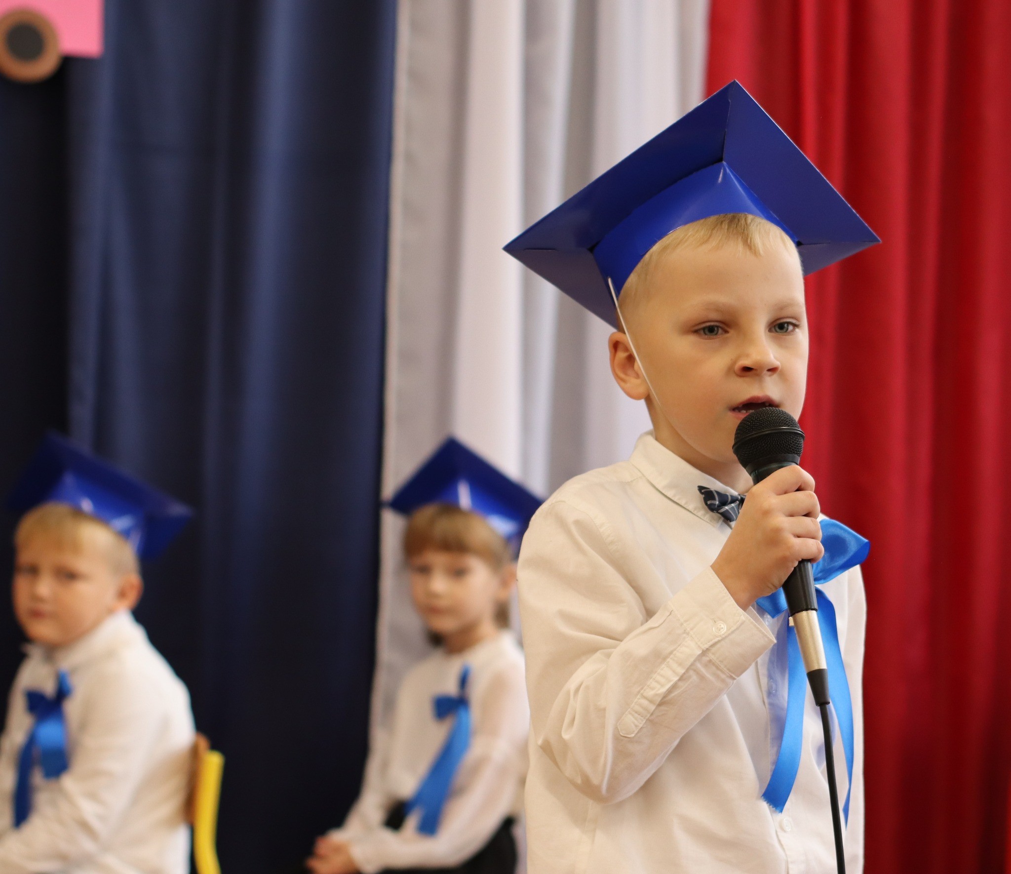 przyjęte w poczet uczniów szkoły. Tegoroczna uroczystość przebiegała pod hasłem „Podróż do nauki”. Pierwszoklasiści z entuzjazmem prezentowali kolejne stacje swojej podróży, odwiedzając m.in.: stację edukacji polonistycznej, matematycznej, przyrodniczej czy muzycznej i plastycznej. Całość przedstawienia była barwna, pełna radości i dziecięcego zaangażowania. Każdy uczeń miał możliwość zaprezentowania swoich umiejętności. Po części artystycznej nastąpił uroczysty akt ślubowania, a następnie pasowanie na ucznia dokonane przez panią Dyrektor. Dzieci otrzymały pamiątkowe dyplomy i drobne upominki przygotowane przez starszych kolegów, a także przez pana wójta. Uroczystość zakończyła się wspólnym poczęstunkiem i radosnymi rozmowami w klasie. Ten dzień z pewnością na długo pozostanie w pamięci wszystkich pierwszoklasistów i ich rodzin – jako symboliczny początek szkolnej przygody, która właśnie się rozpoczęła.