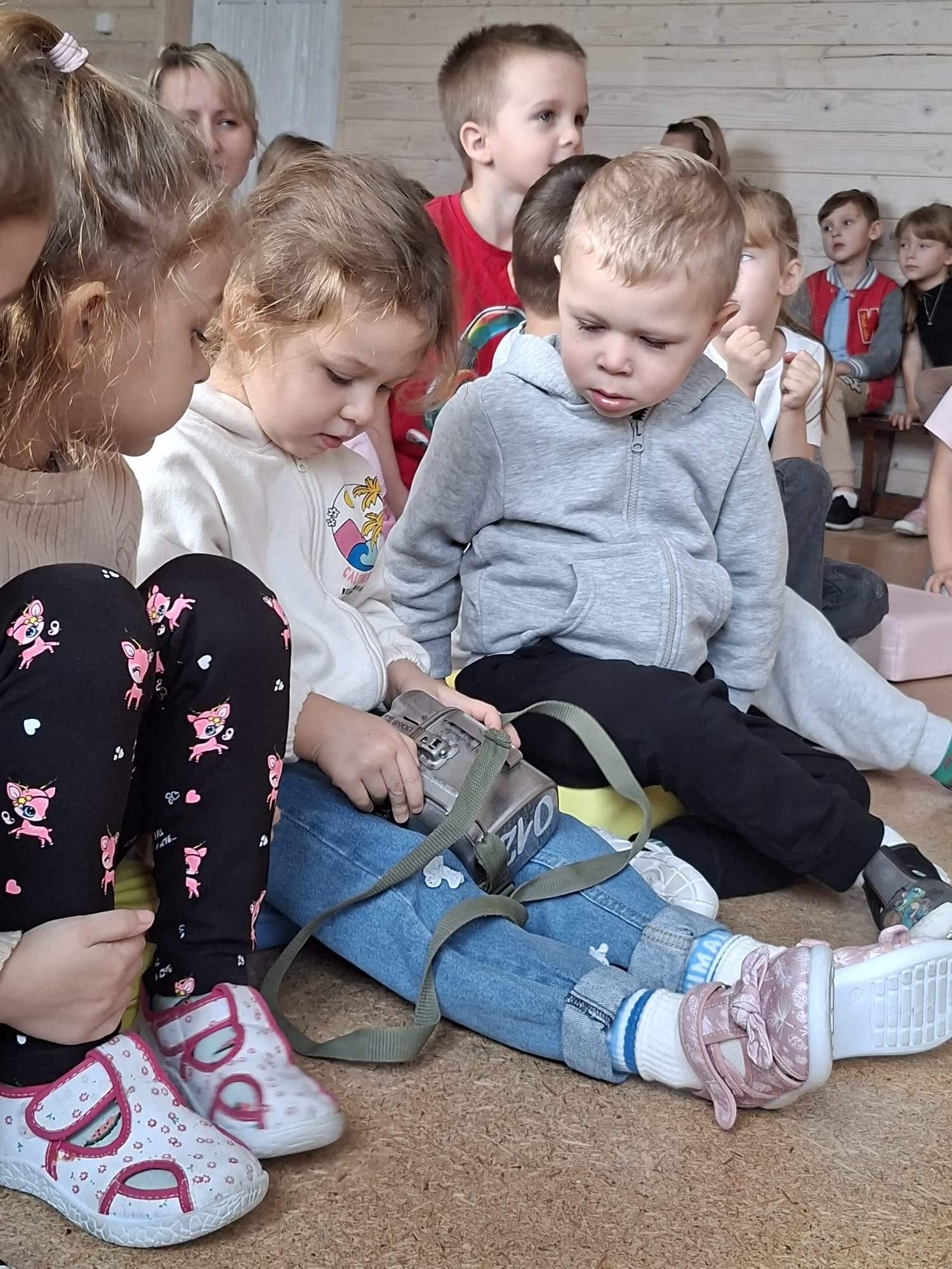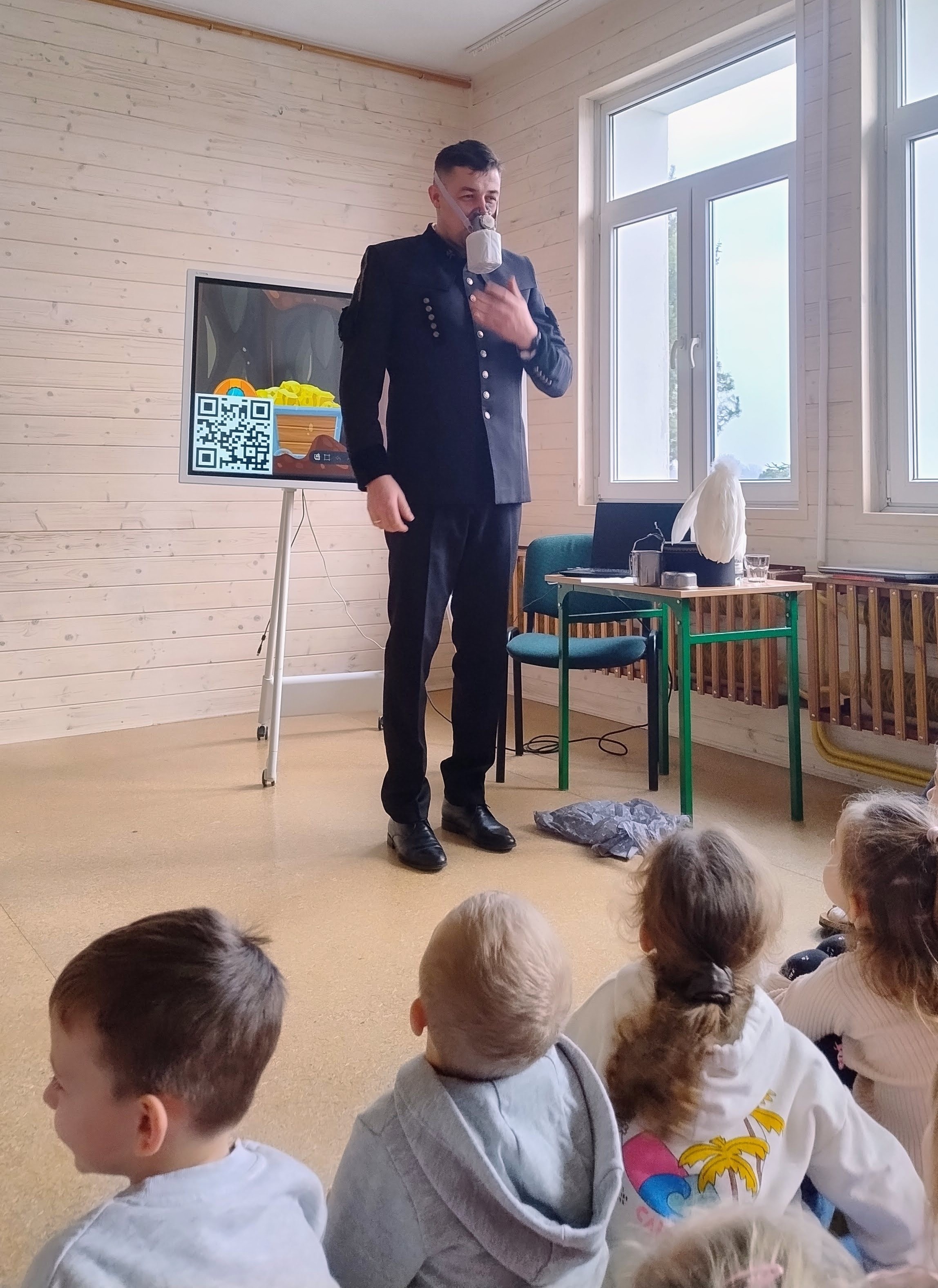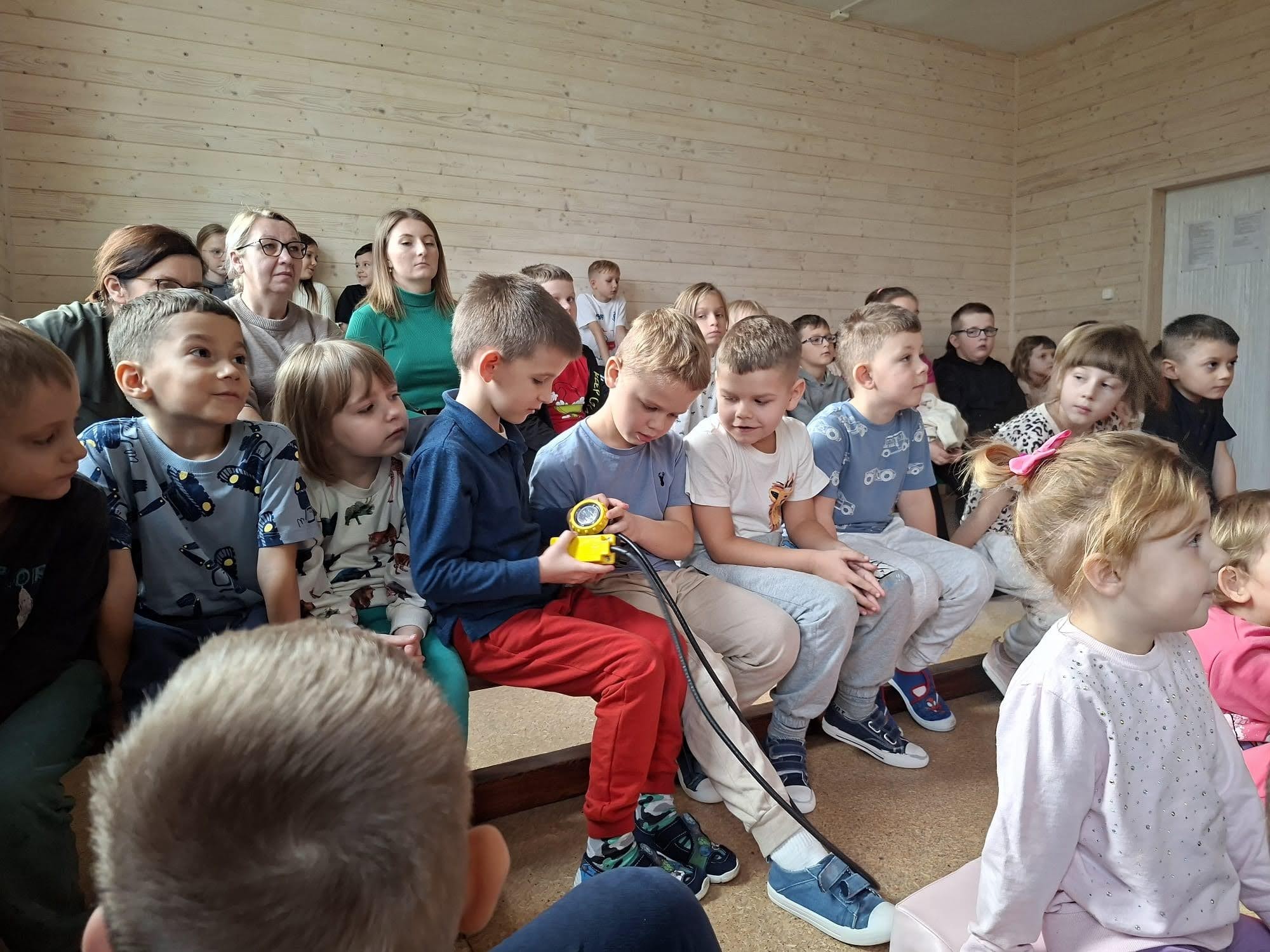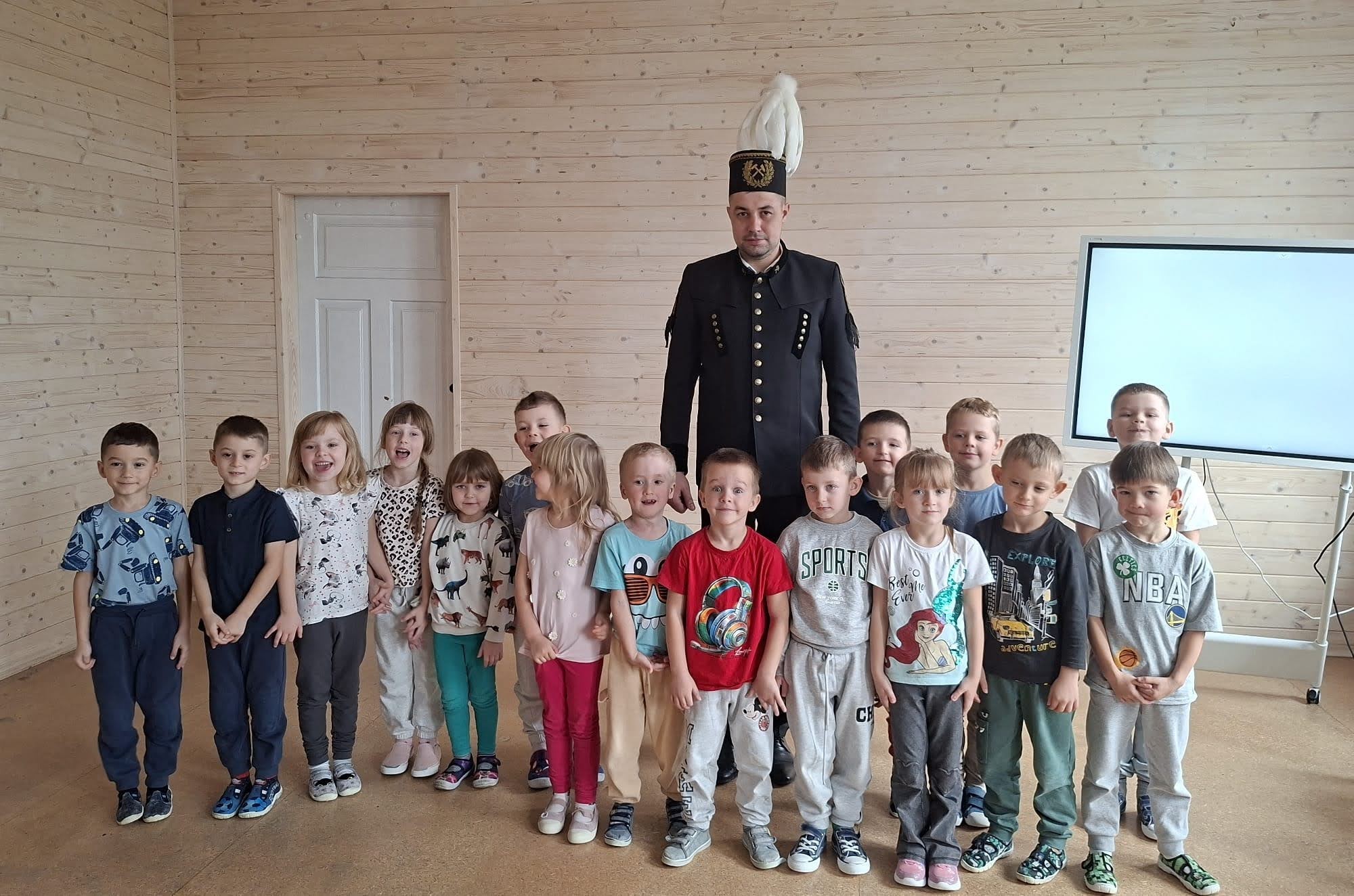 Pan Jakub przygotował także prezentację w formie bajki, która w ciekawy i przystępny sposób przybliżyła dzieciom temat pracy pod ziemią. Duże zainteresowanie wzbudziły również rekwizyty, które przyniósł – mali uczestnicy mogli z bliska zobaczyć elementy stroju i wyposażenia górnika.