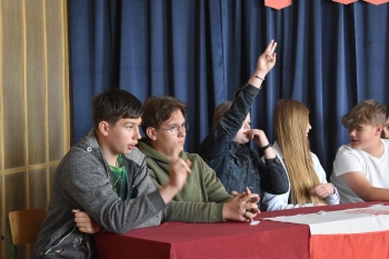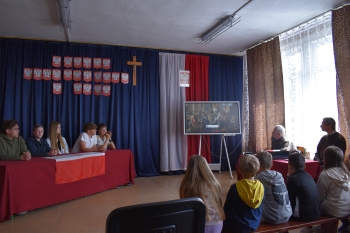 Po krótkiej projekcji filmu na temat obrazu Jana Matejki ,,Konstytucja 3 Maja 1791 roku’’ sześcioro uczniów klas VI – VIII przystąpiło do Szkolnego Konkursu Wiedzy o Konstytucji 3 Maja.