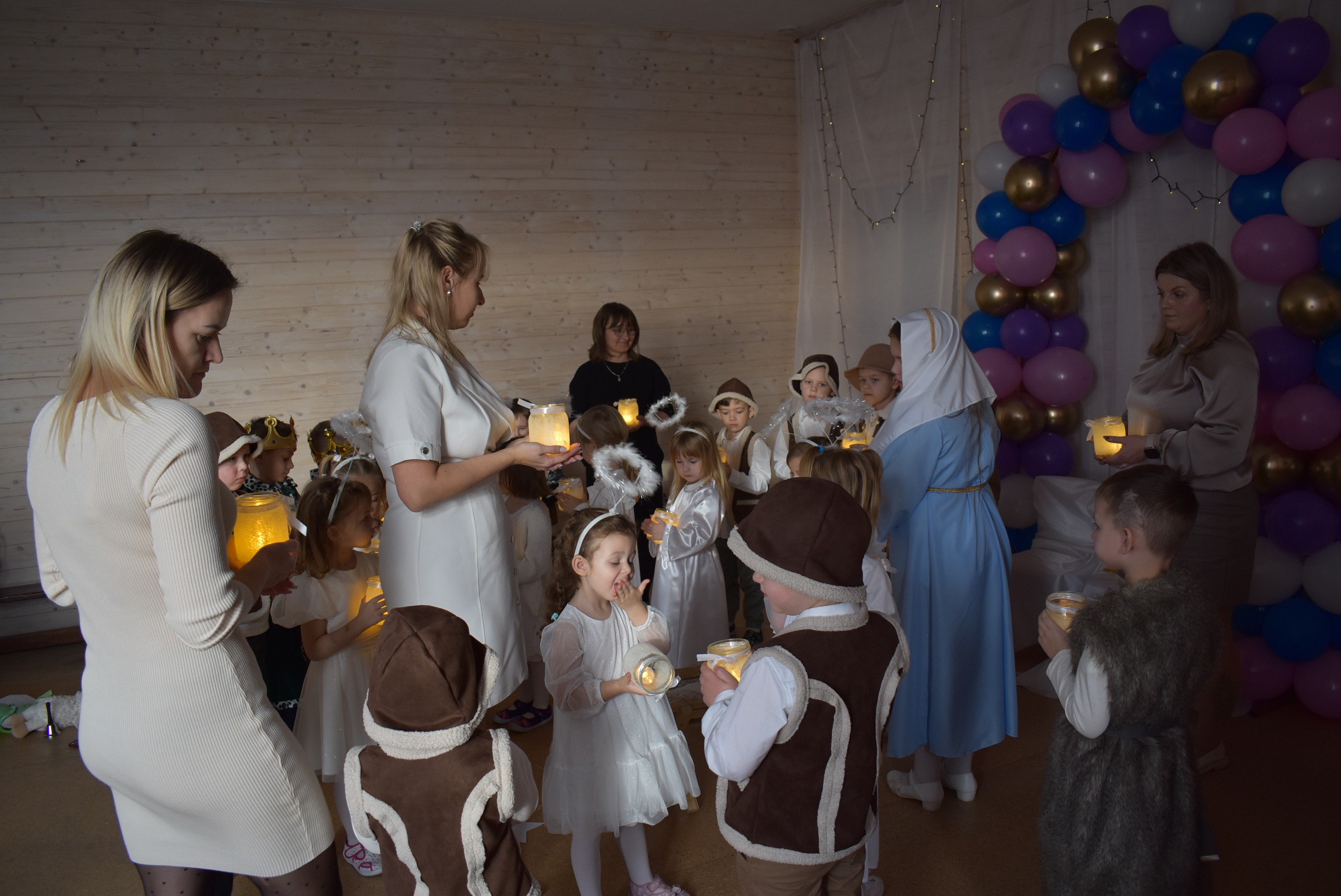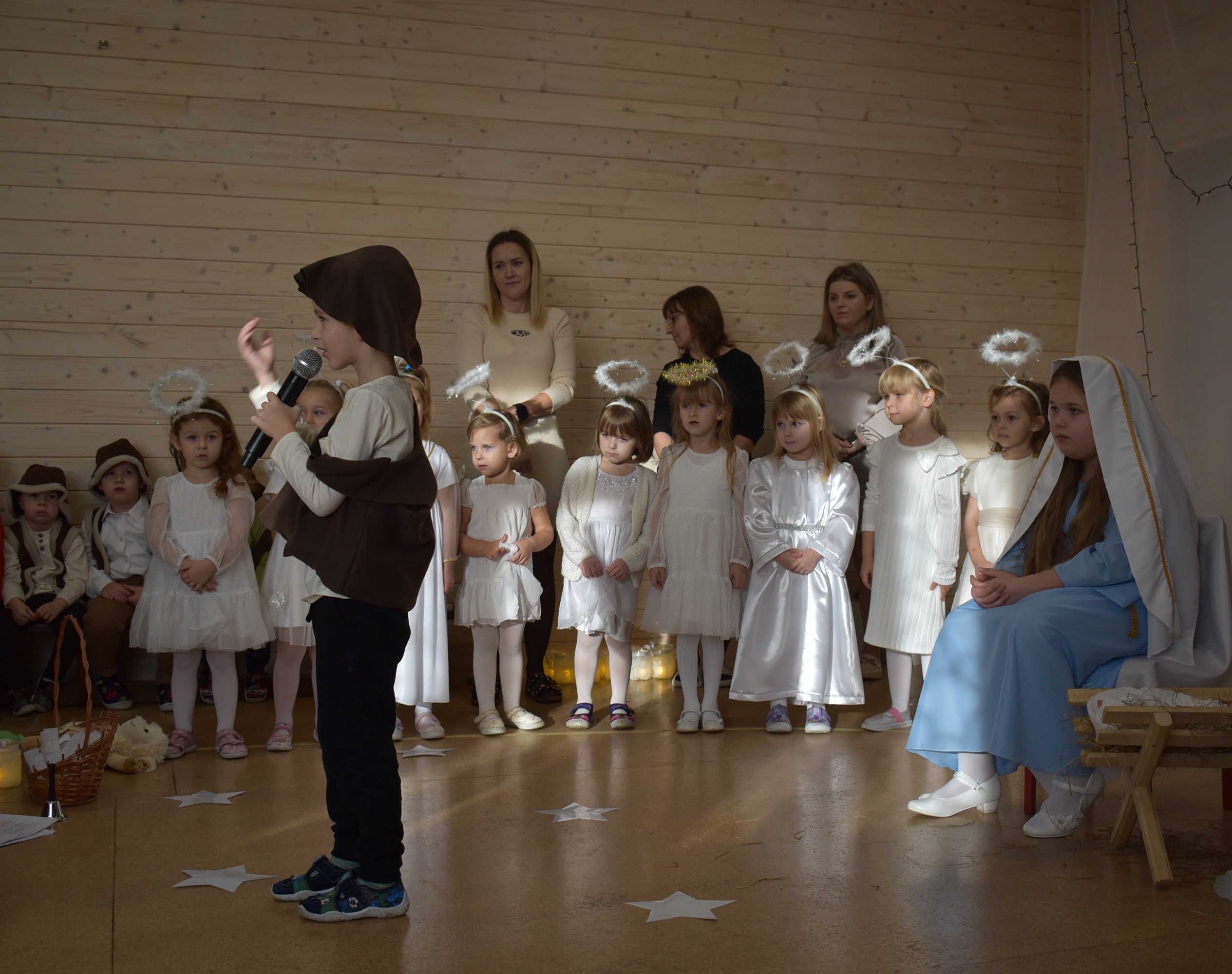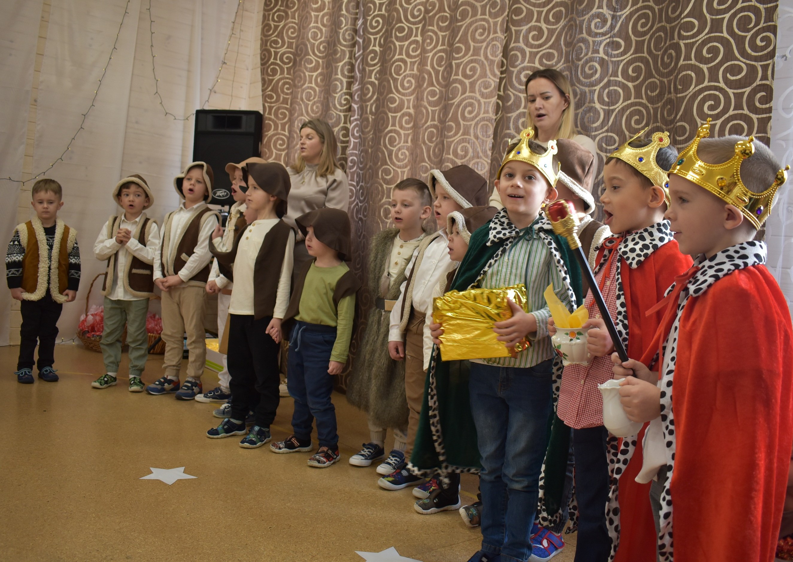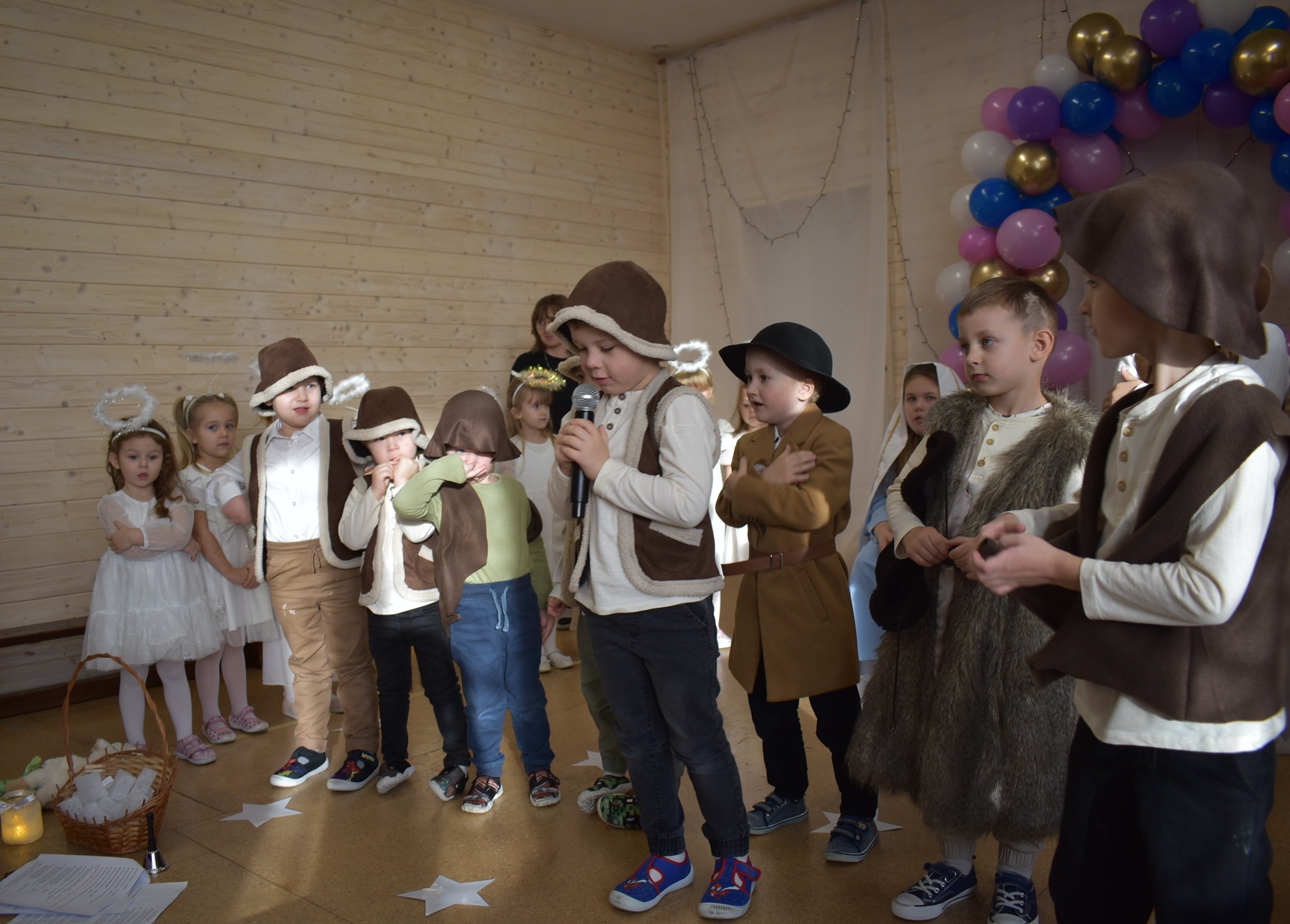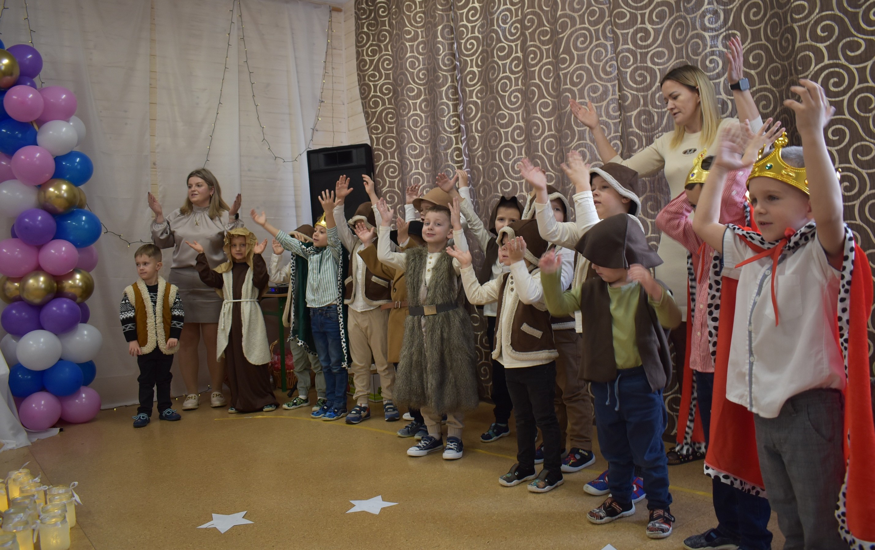 Dzieci zaprezentowały piękny program artystyczny o tematyce bożonarodzeniowej. Wystąpiły przebrane za aniołki, pasterzy, Maryję, Józefa oraz Trzech Króli. Mali artyści z dużym zaangażowaniem recytowali wierszyki, śpiewali kolędy i pastorałki. Szczególne wzruszenie wzbudził taniec aniołków do piosenki „Światełko”, podczas którego dzieci prezentowały świecące gwiazdeczki trzymane na dłoniach, a także taniec z lampionami do piosenki "Noel", wprowadzając zgromadzonych w radosny, świąteczny nastrój.