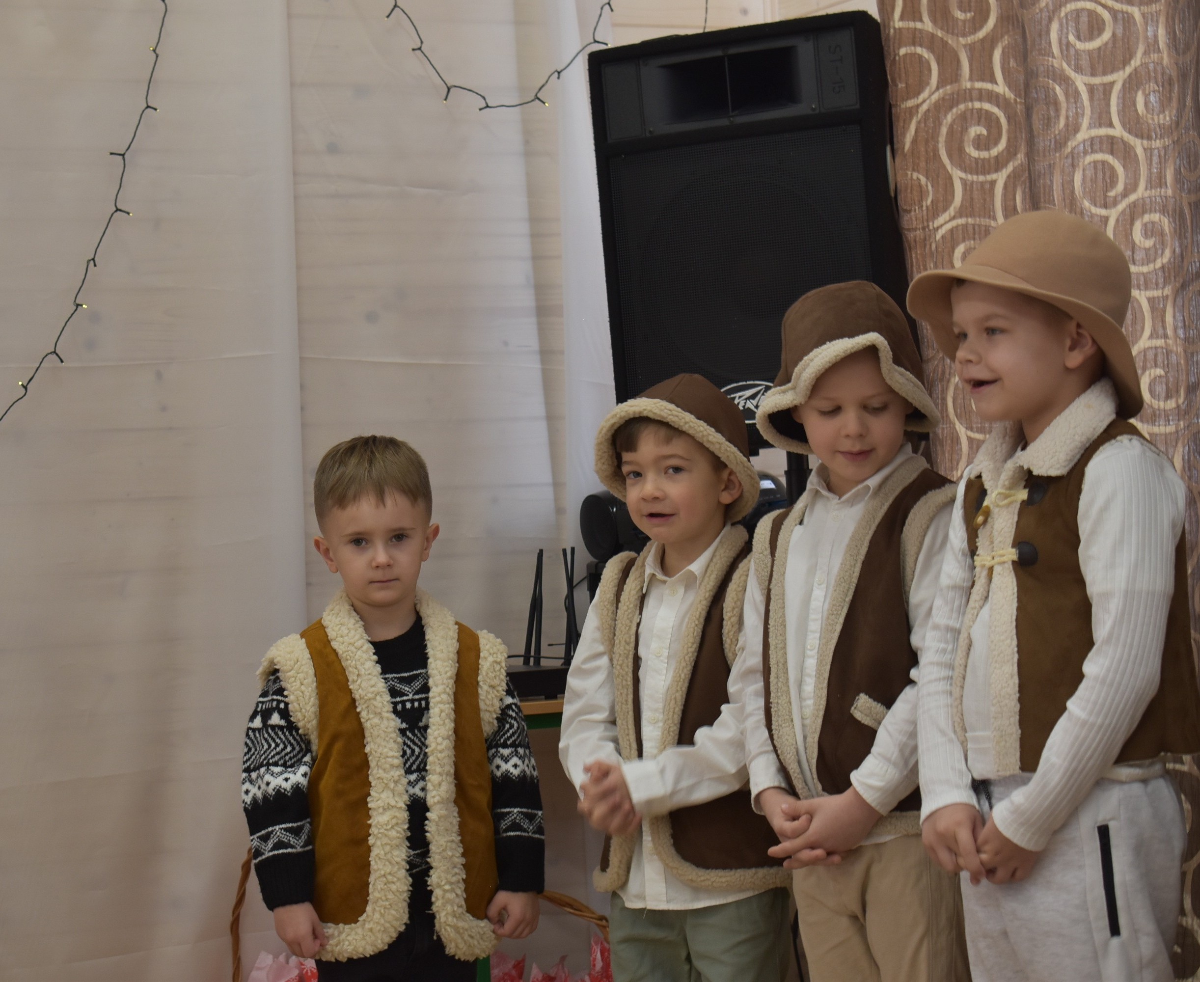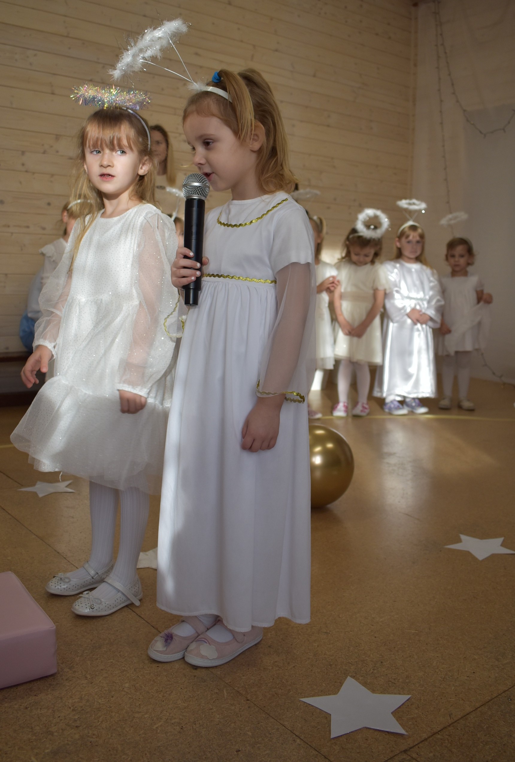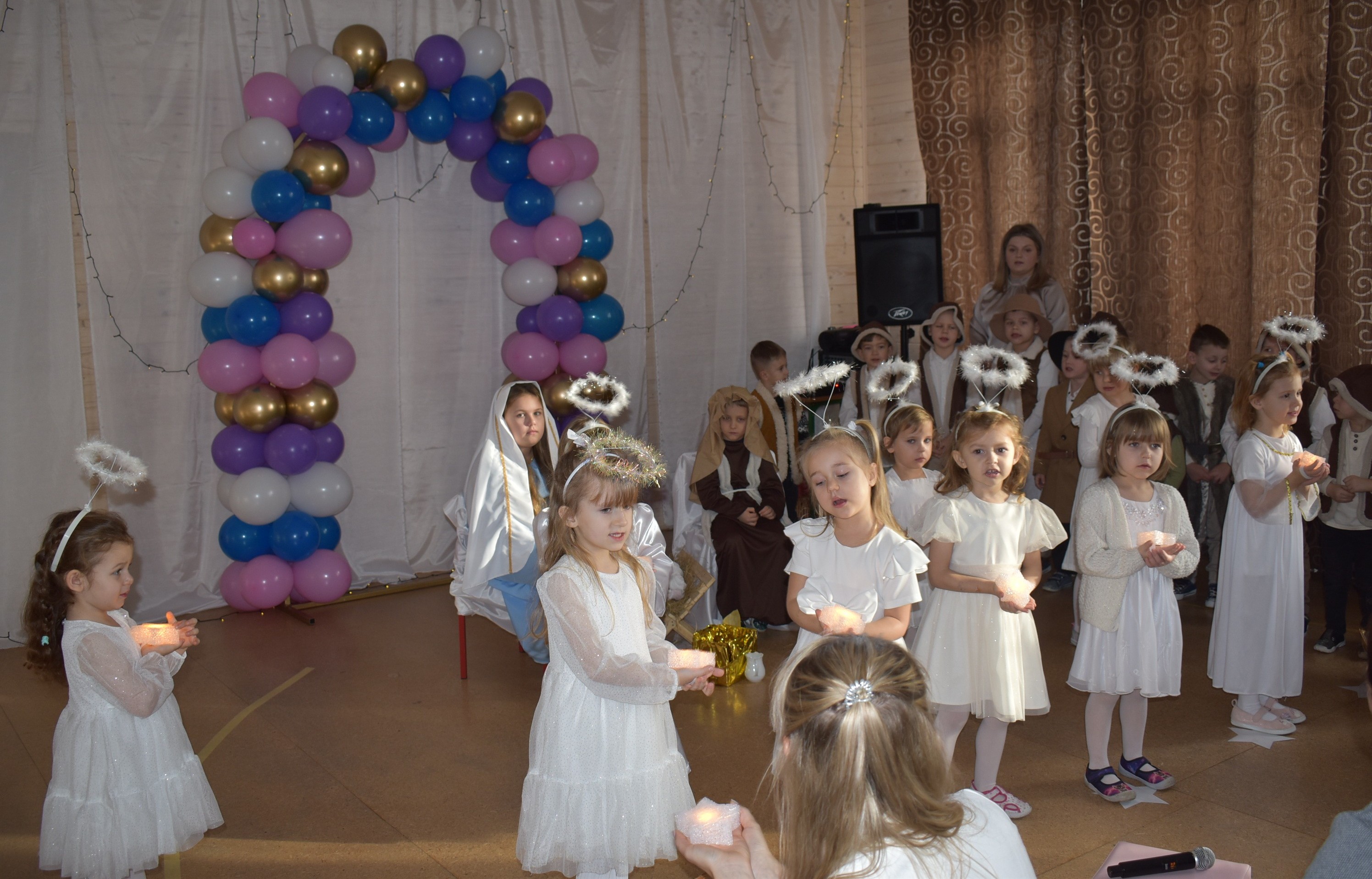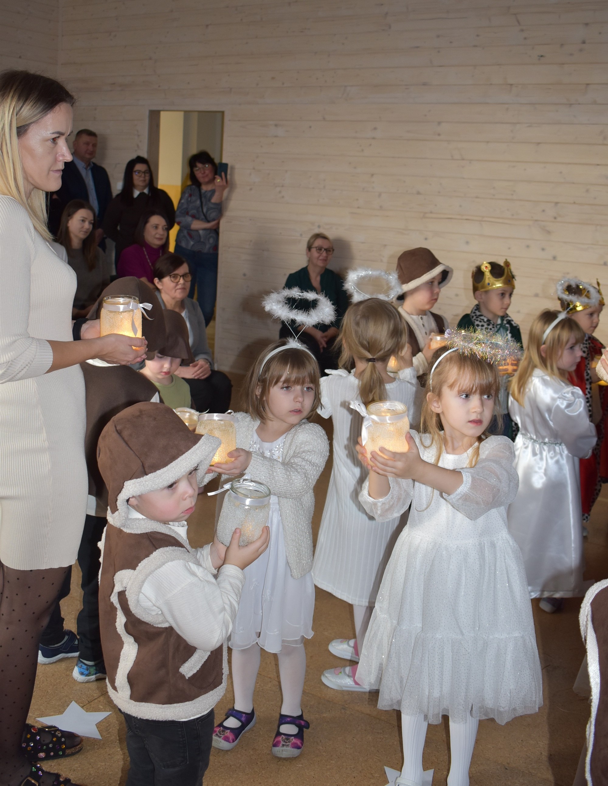 Dzieci zaprezentowały piękny program artystyczny o tematyce bożonarodzeniowej. Wystąpiły przebrane za aniołki, pasterzy, Maryję, Józefa oraz Trzech Króli. Mali artyści z dużym zaangażowaniem recytowali wierszyki, śpiewali kolędy i pastorałki. Szczególne wzruszenie wzbudził taniec aniołków do piosenki „Światełko”, podczas którego dzieci prezentowały świecące gwiazdeczki trzymane na dłoniach, a także taniec z lampionami do piosenki "Noel", wprowadzając zgromadzonych w radosny, świąteczny nastrój.