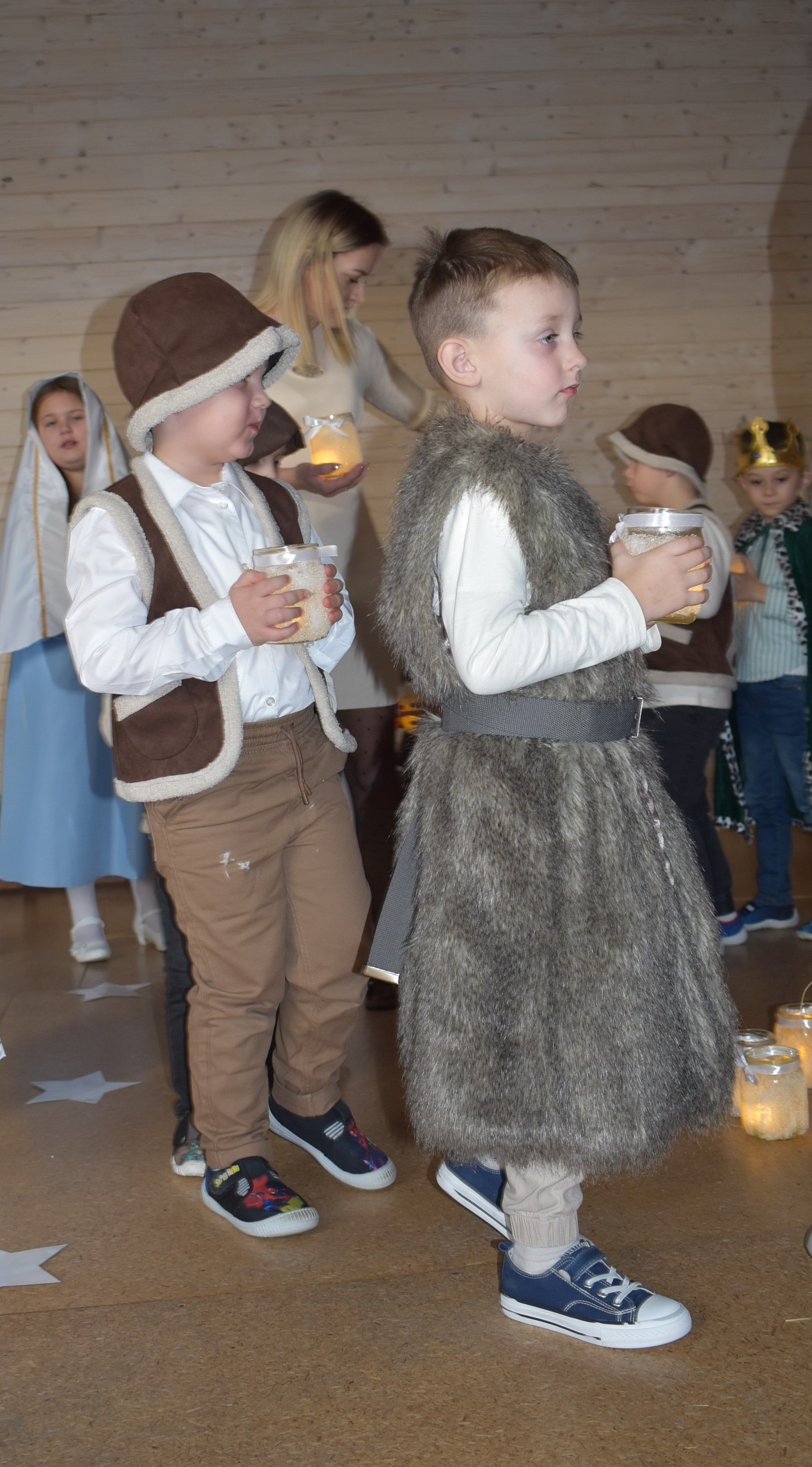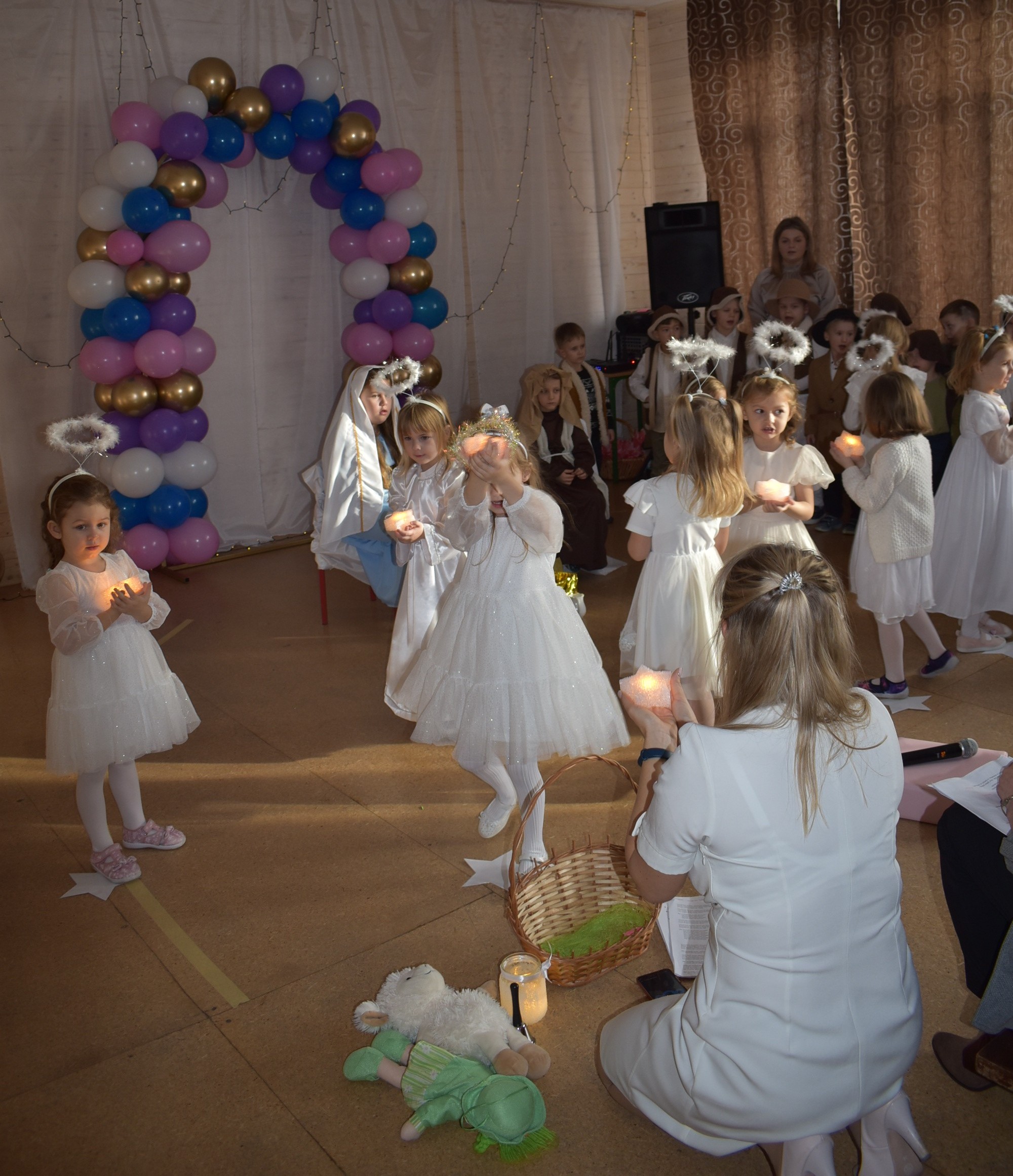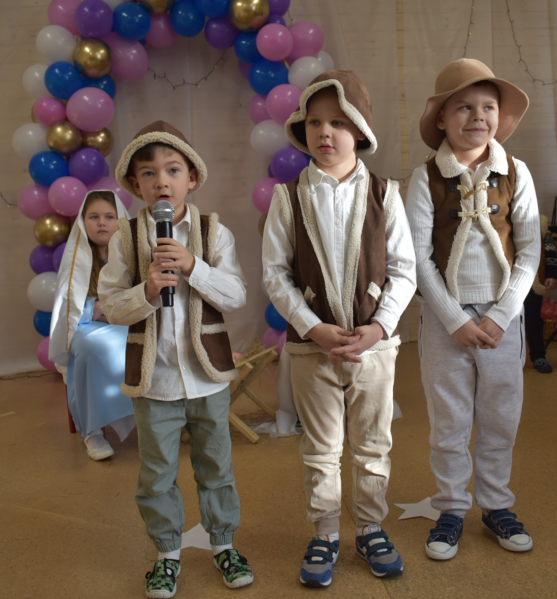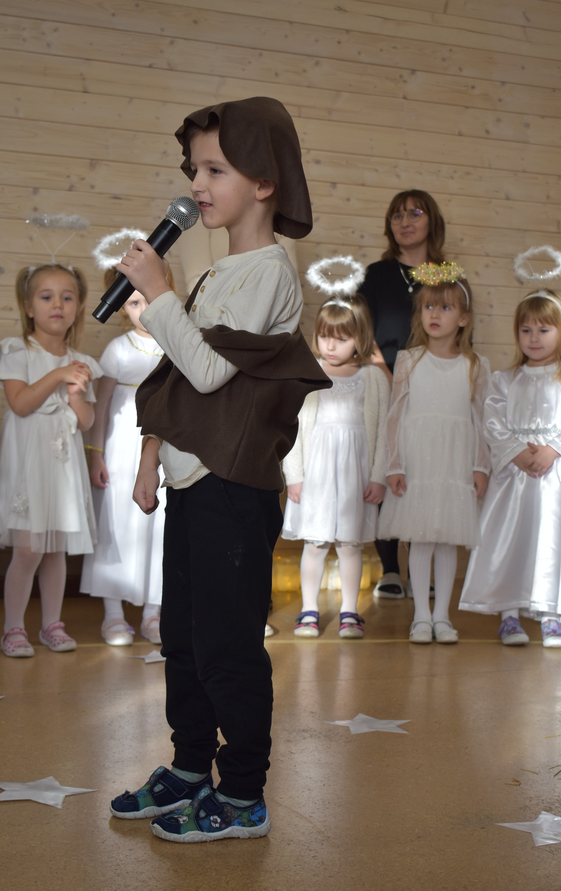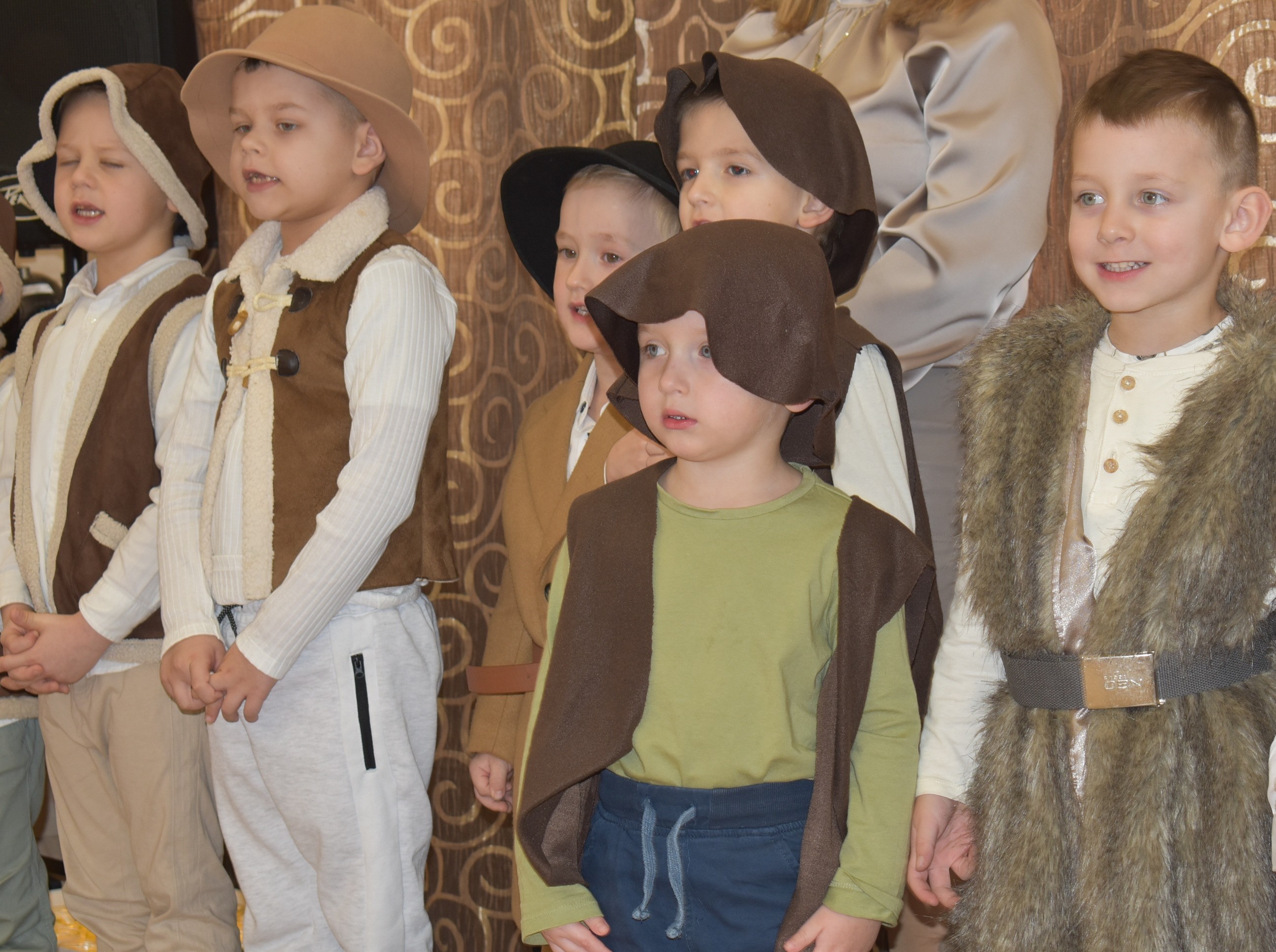 Dzieci zaprezentowały piękny program artystyczny o tematyce bożonarodzeniowej. Wystąpiły przebrane za aniołki, pasterzy, Maryję, Józefa oraz Trzech Króli. Mali artyści z dużym zaangażowaniem recytowali wierszyki, śpiewali kolędy i pastorałki. Szczególne wzruszenie wzbudził taniec aniołków do piosenki „Światełko”, podczas którego dzieci prezentowały świecące gwiazdeczki trzymane na dłoniach, a także taniec z lampionami do piosenki "Noel", wprowadzając zgromadzonych w radosny, świąteczny nastrój.