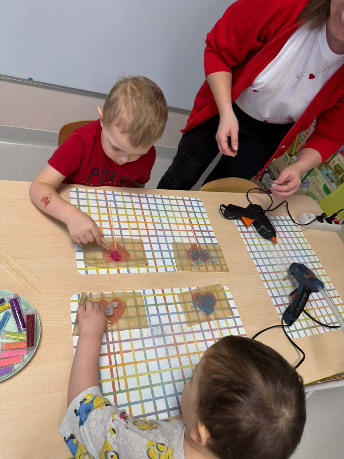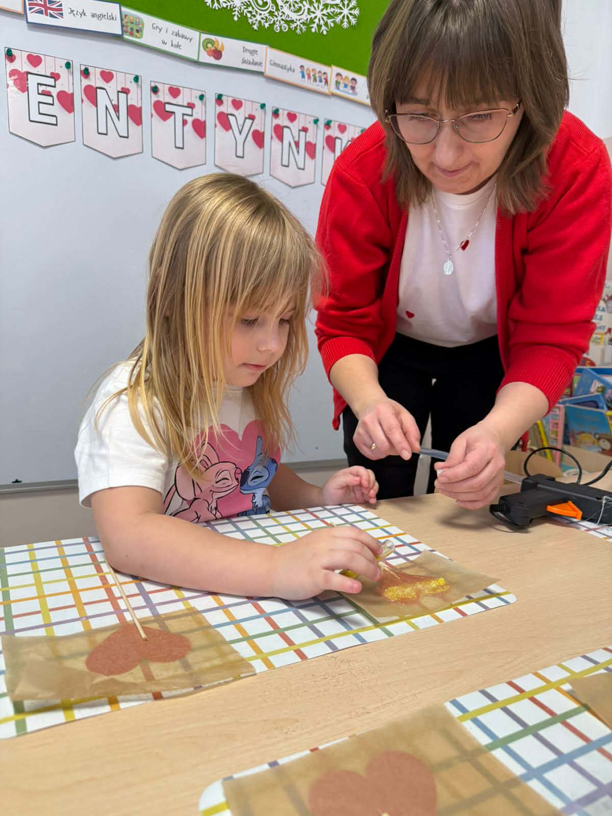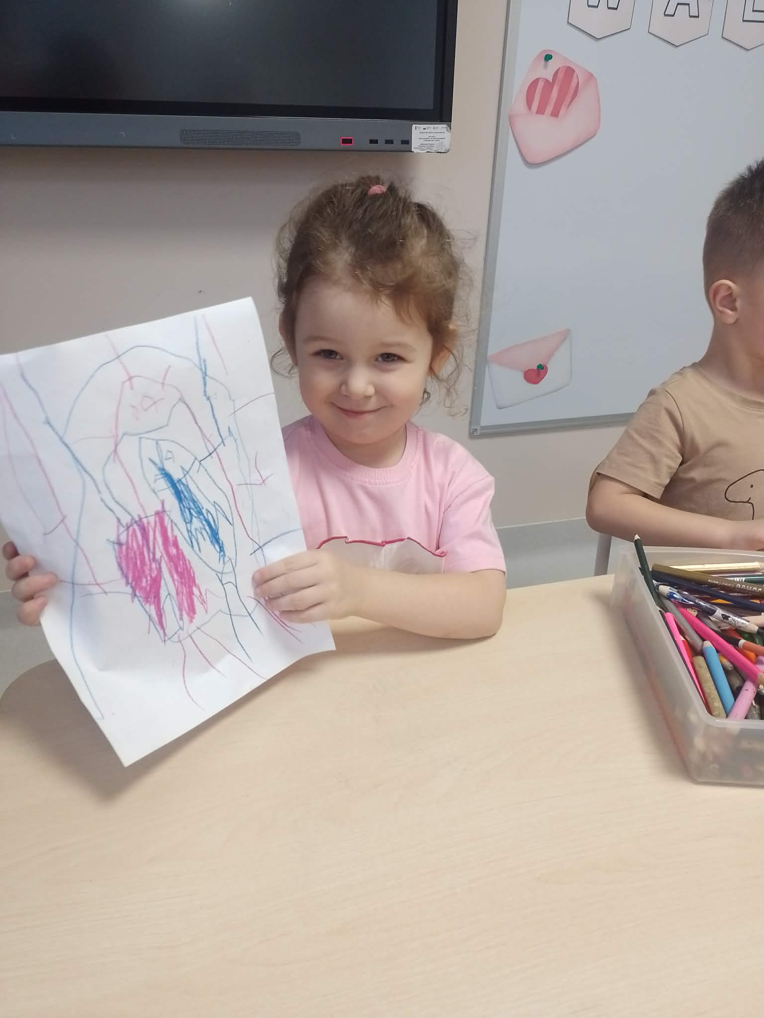 Dnia 13 lutego 2026 w oddziale przedszkolnym odbyły się Walentynki. Na początku dnia dzieci zapoznały się z historią świętego Walentego oraz dowiedziały się dlaczego akurat 14 lutego świętują zakochani. Rozmawiały o tym, czym jest miłość i przyjaźń oraz jak można okazywać sobie życzliwość, troskę i uczucie. Następnie rozwiązywały zadania walentynkowe, rozwijając swoje umiejętności językowe, logiczne myślenie i spostrzegawczość. Nie zabrakło również wesołych zabaw, które dostarczyły dzieciom wiele radości i uśmiechu. Na zakończenie zajęć w ramach pracy plastycznej przedszkolaki wykonały piękne brokatowe serca, które mogły podarować tym, których najbardziej kochają - swoim rodzicom oraz rodzeństwu. Zajęcia upłynęły w miłej, serdecznej atmosferze, pełnej ciepła i przyjaźni.