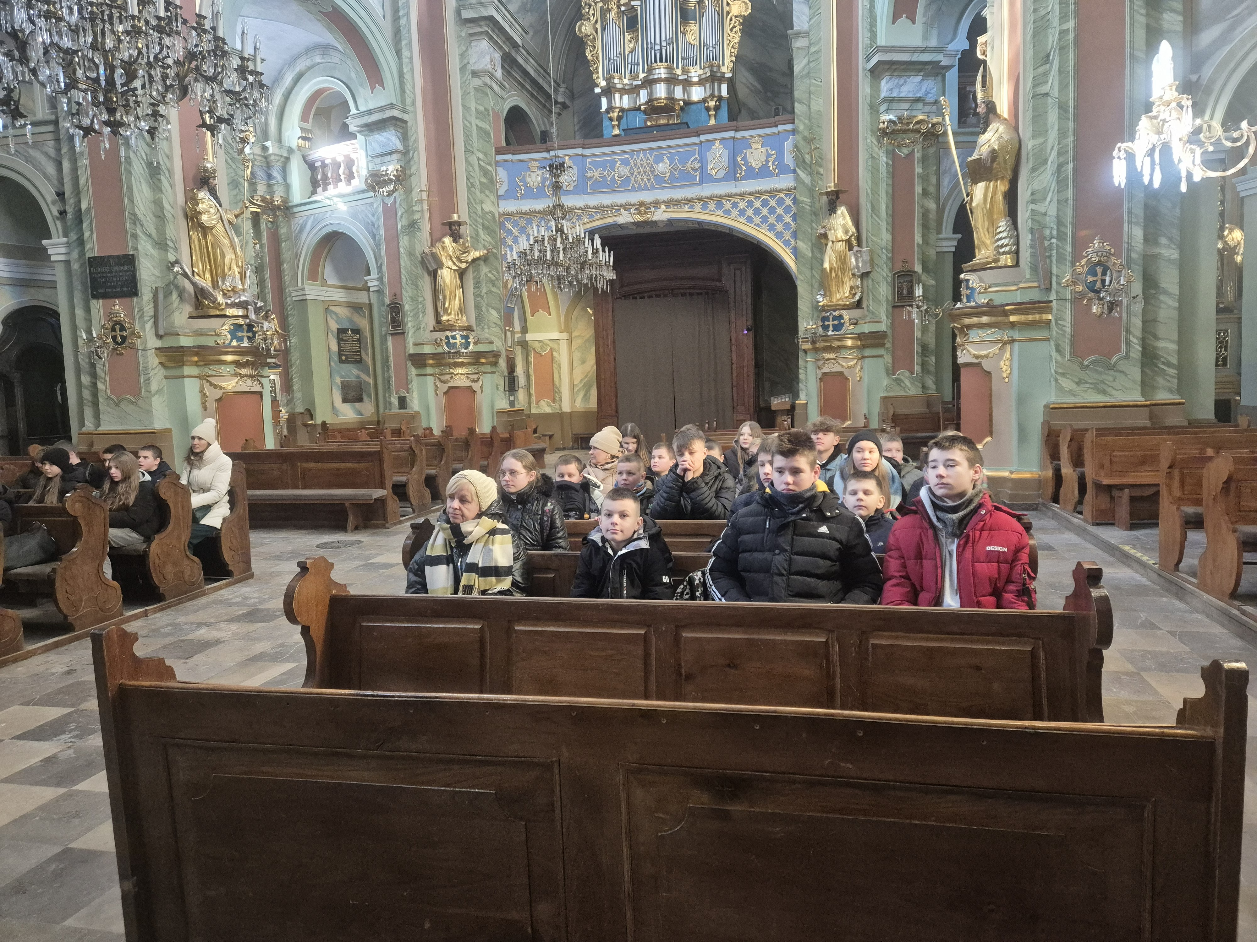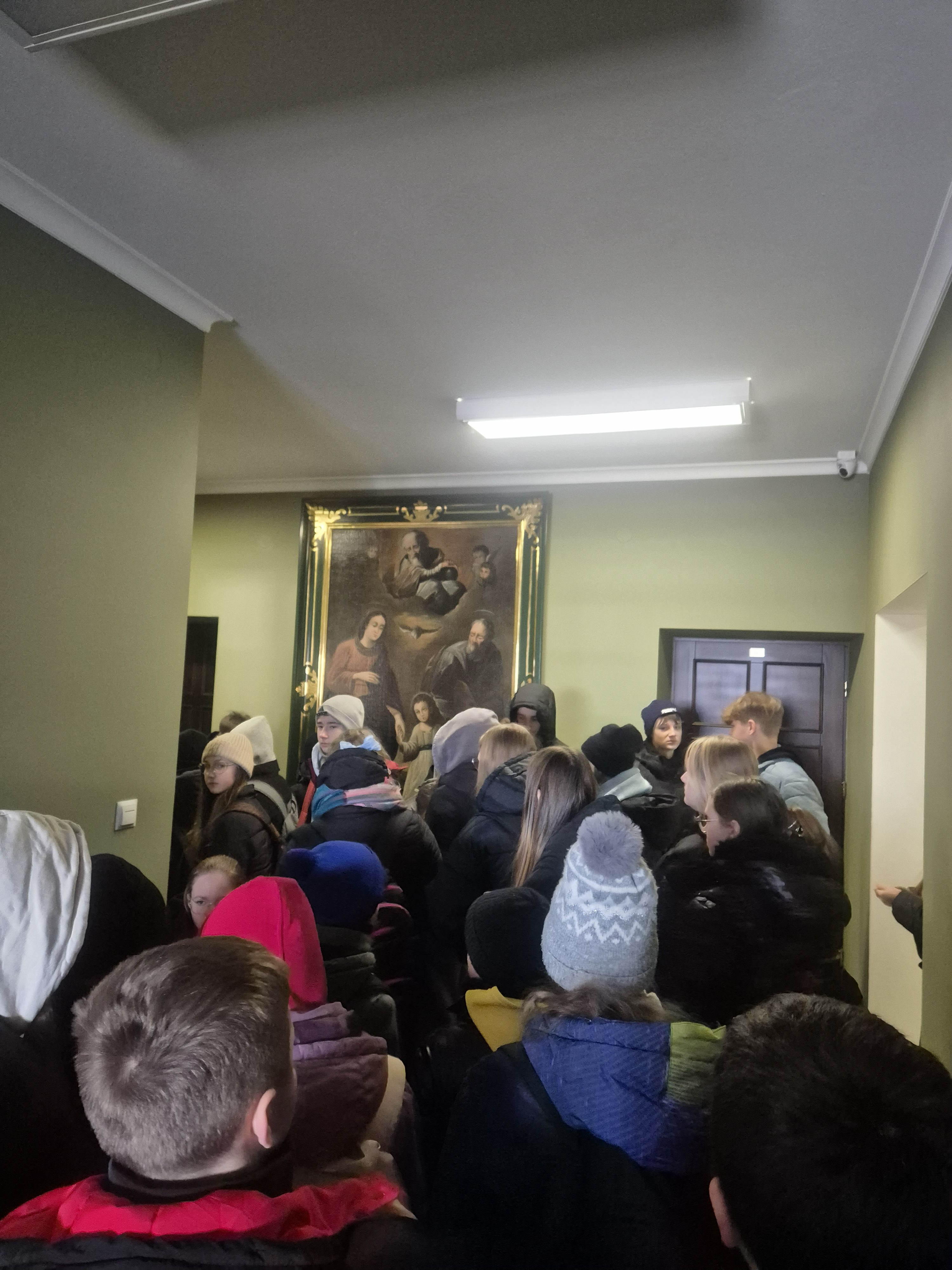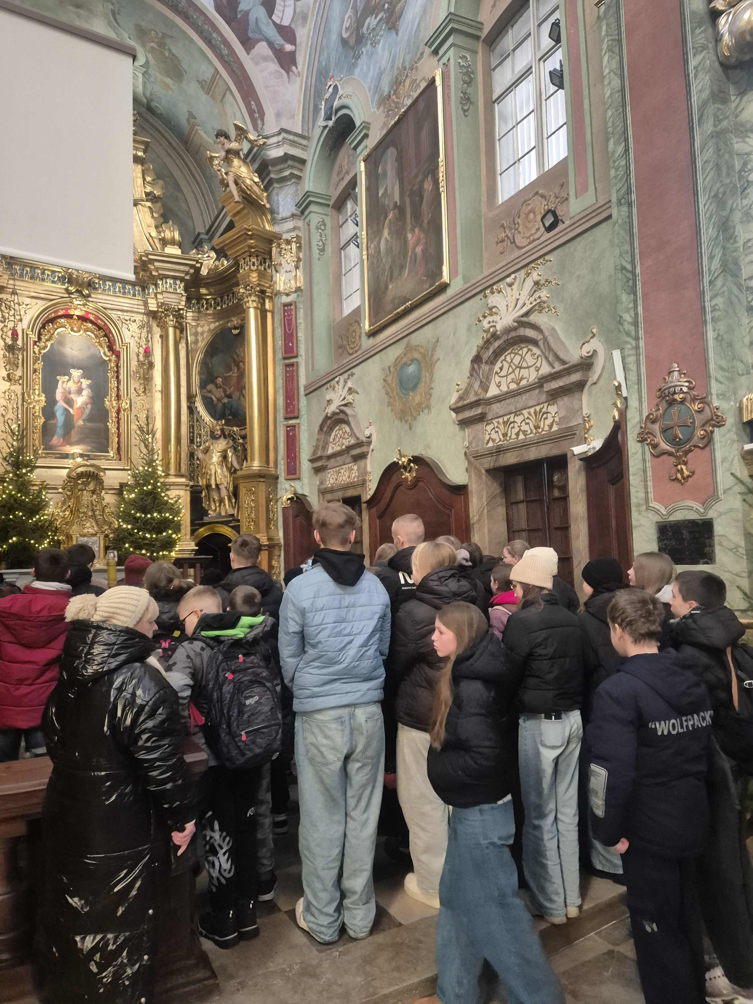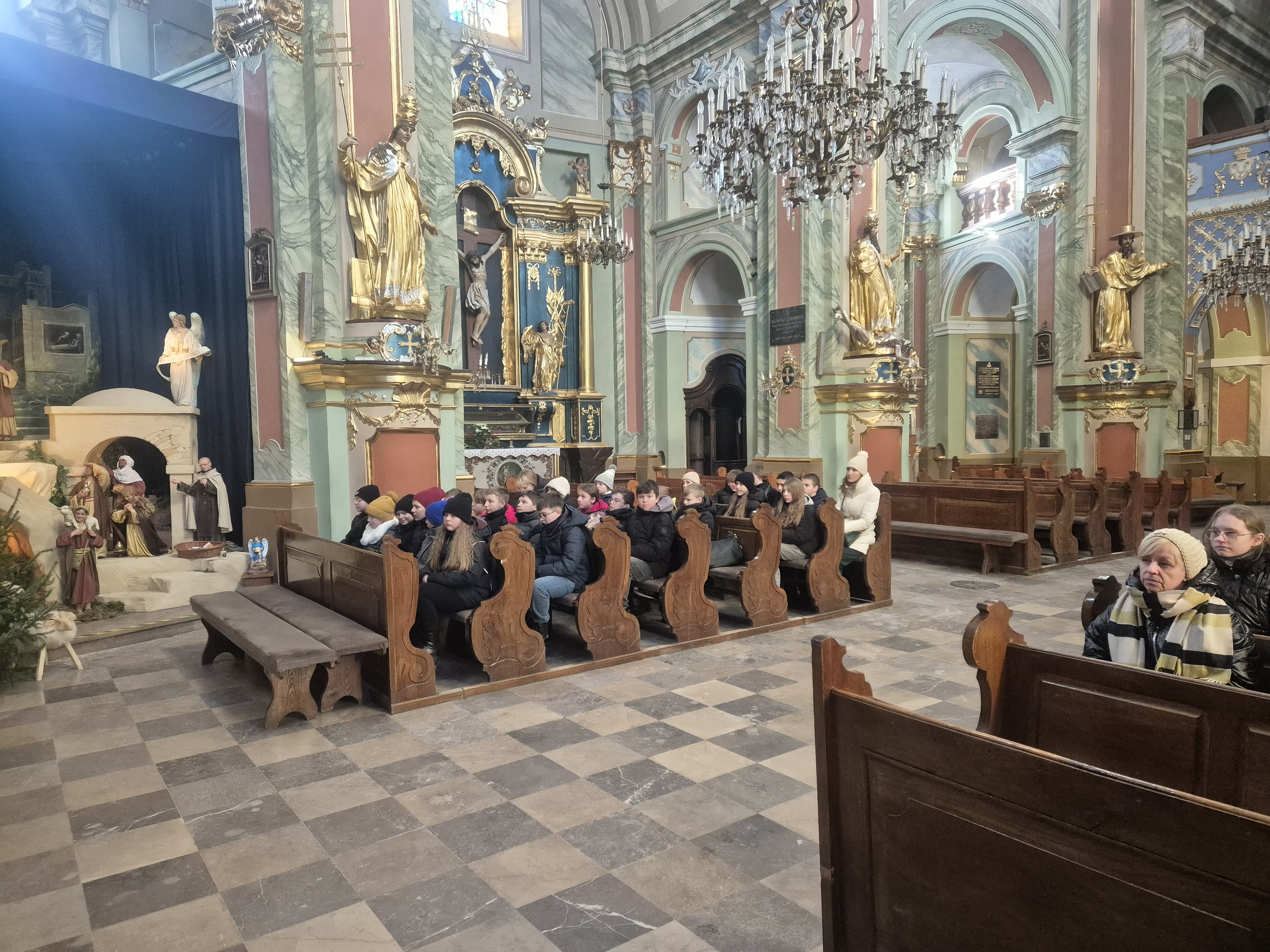 Pierwszym punktem programu było zwiedzanie Bazyliki św. Anny w Lubartowie, jednego z najważniejszych zabytków sakralnych regionu. Uczniowie mieli okazję poznać historię świątyni, jej architekturę oraz znaczenie dla lokalnej społeczności. Następnie grupa udała się do Muzeum Parafialnego, gdzie obejrzała cenne eksponaty związane z dziejami parafii i miasta. Kolejnym punktem programu było zwiedzanie Panoramy Lubartowskiej, czyli niezwykłej szopki z ruchomymi postaciami przedstawiającymi bohaterów z historii Polski, regionu oraz samego Lubartowa. Figurki przesuwają się na tle makiety miasta i symbolicznie kłaniają się figurze św. Anny, tworząc widowiskową i pełną lokalnych odniesień prezentację.Po tej części uczestnicy wycieczki udali się do Spółdzielni Mieszkaniowej w Lubartowie, gdzie obejrzeli spektakl „Opowieść wigilijna” w wykonaniu aktorów Narodowego Teatru Edukacji im. Adama Mickiewicza. Przedstawienie, oparte na klasycznym dziele Charlesa Dickensa, dostarczyło uczniom wielu wzruszeń i skłoniło do refleksji nad wartościami takimi jak dobroć, empatia i umiejętność dostrzegania potrzeb innych.