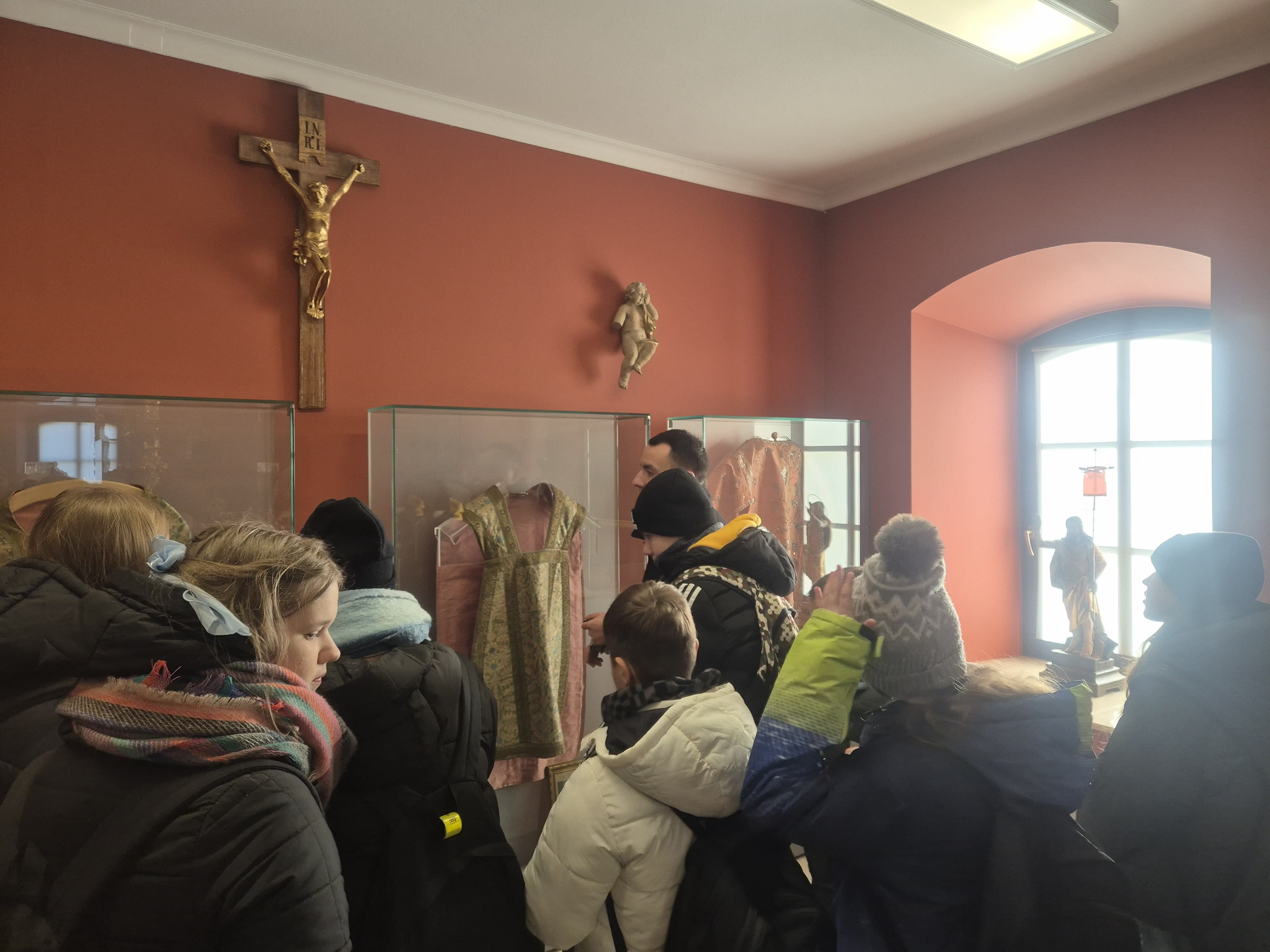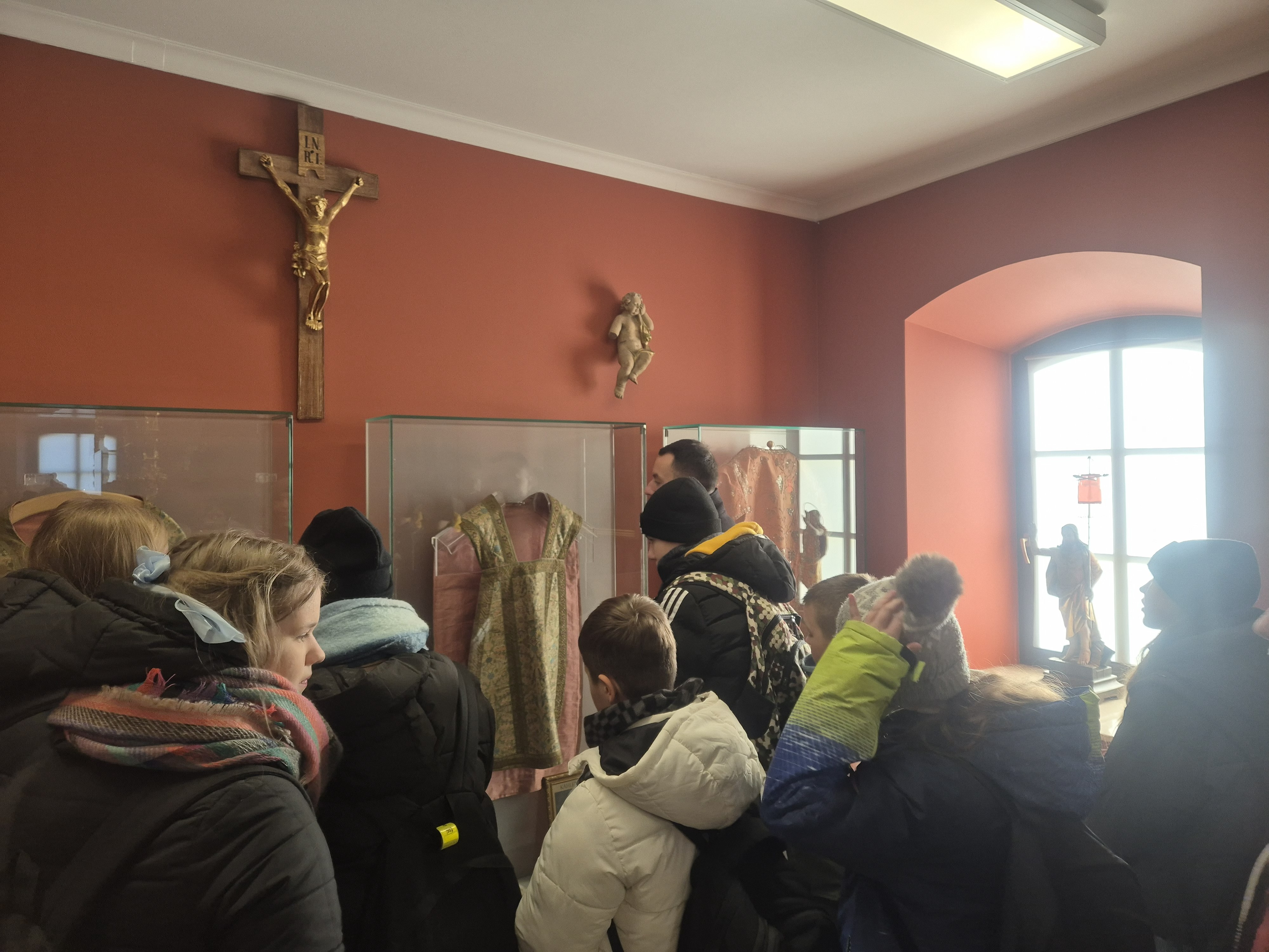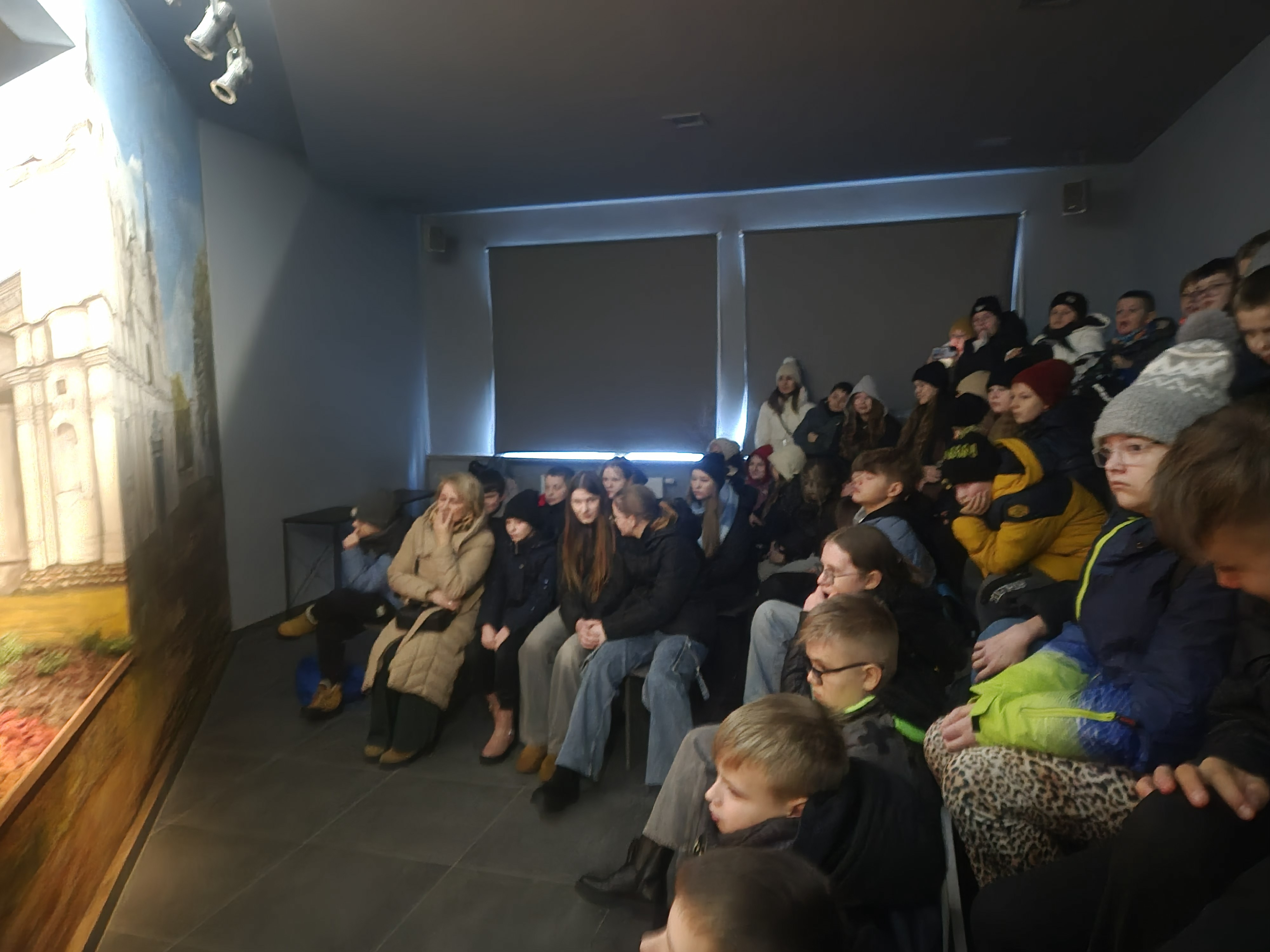 Pierwszym punktem programu było zwiedzanie Bazyliki św. Anny w Lubartowie, jednego z najważniejszych zabytków sakralnych regionu. Uczniowie mieli okazję poznać historię świątyni, jej architekturę oraz znaczenie dla lokalnej społeczności. Następnie grupa udała się do Muzeum Parafialnego, gdzie obejrzała cenne eksponaty związane z dziejami parafii i miasta. Kolejnym punktem programu było zwiedzanie Panoramy Lubartowskiej, czyli niezwykłej szopki z ruchomymi postaciami przedstawiającymi bohaterów z historii Polski, regionu oraz samego Lubartowa. Figurki przesuwają się na tle makiety miasta i symbolicznie kłaniają się figurze św. Anny, tworząc widowiskową i pełną lokalnych odniesień prezentację.Po tej części uczestnicy wycieczki udali się do Spółdzielni Mieszkaniowej w Lubartowie, gdzie obejrzeli spektakl „Opowieść wigilijna” w wykonaniu aktorów Narodowego Teatru Edukacji im. Adama Mickiewicza. Przedstawienie, oparte na klasycznym dziele Charlesa Dickensa, dostarczyło uczniom wielu wzruszeń i skłoniło do refleksji nad wartościami takimi jak dobroć, empatia i umiejętność dostrzegania potrzeb innych.