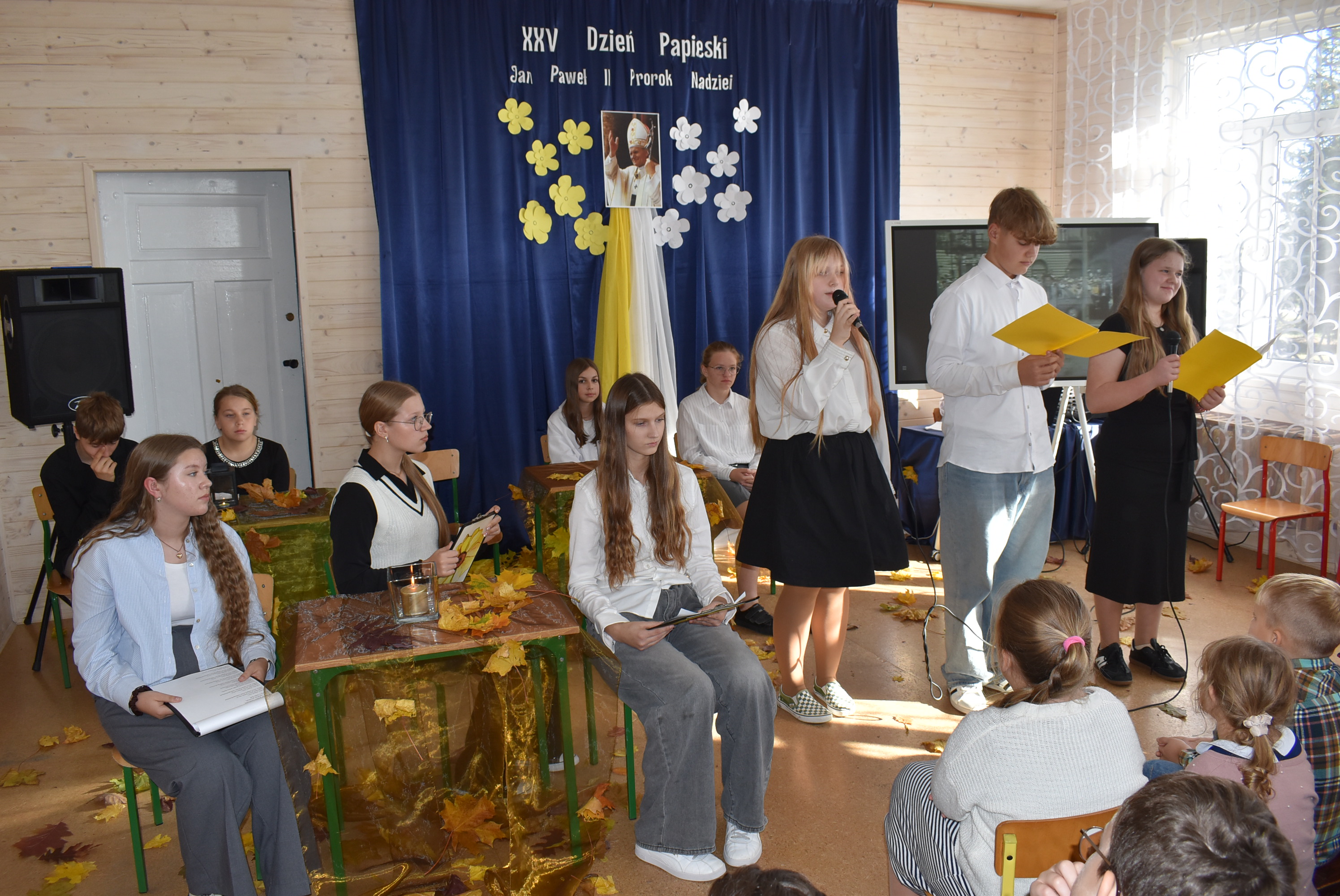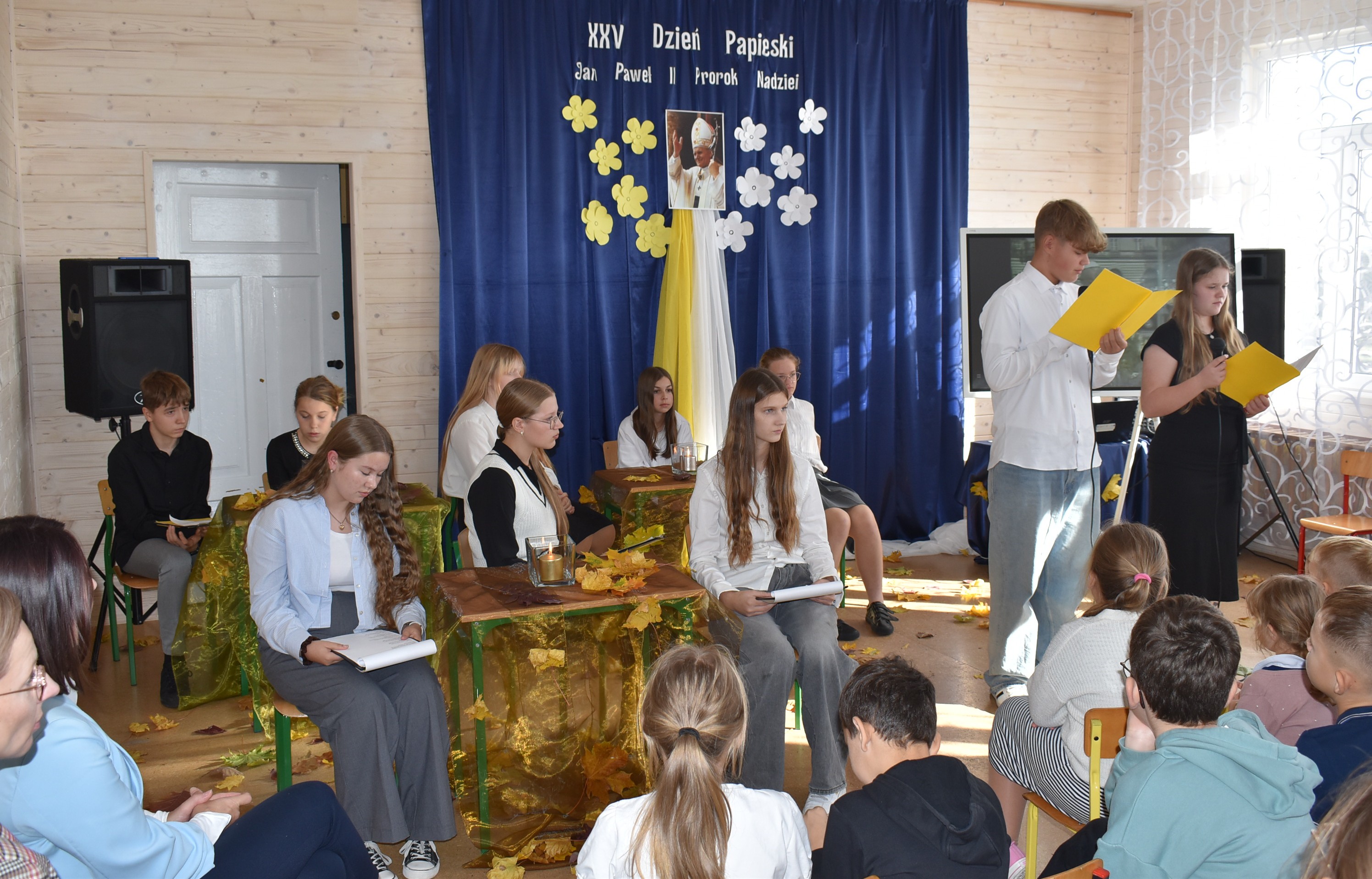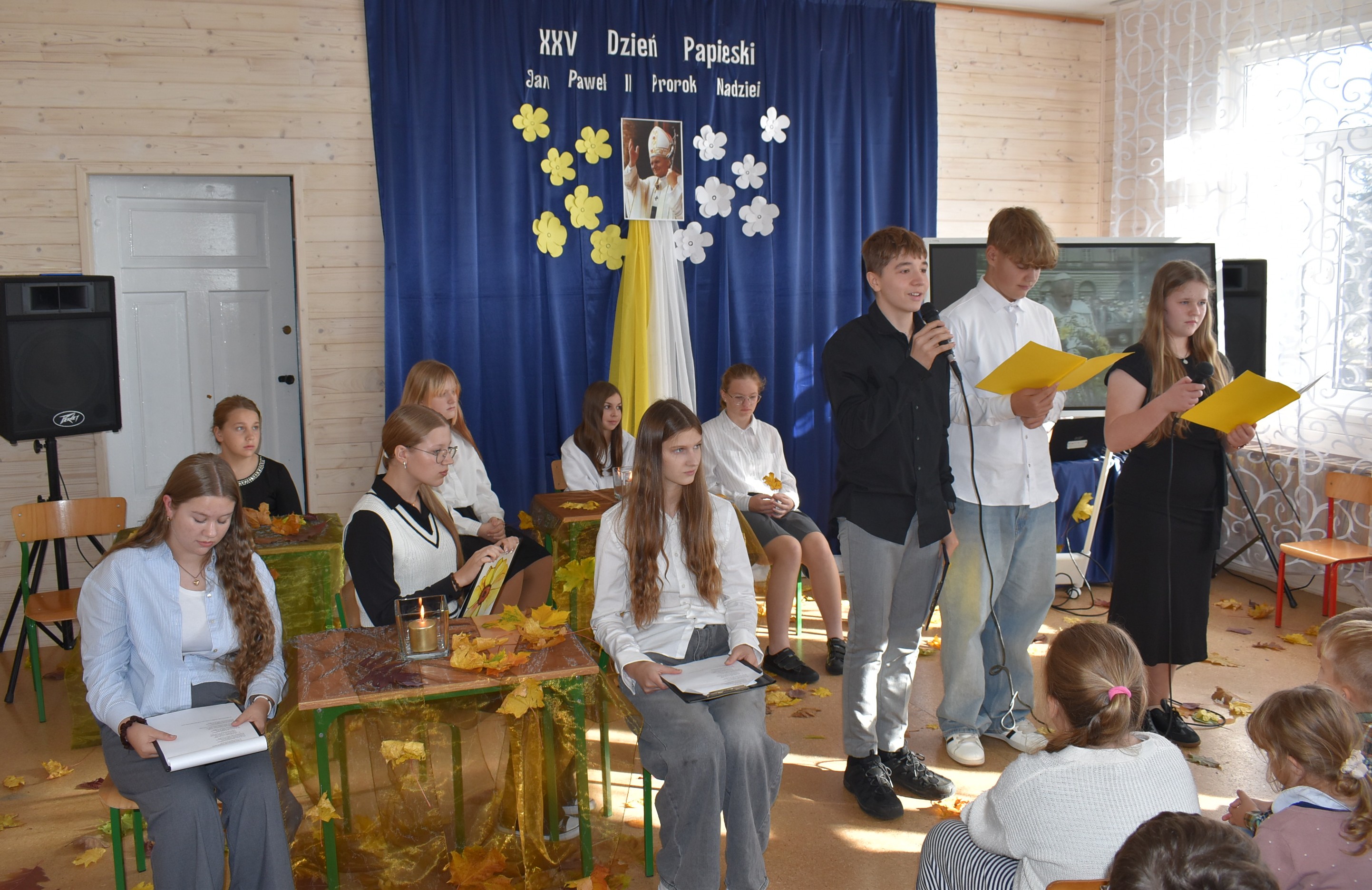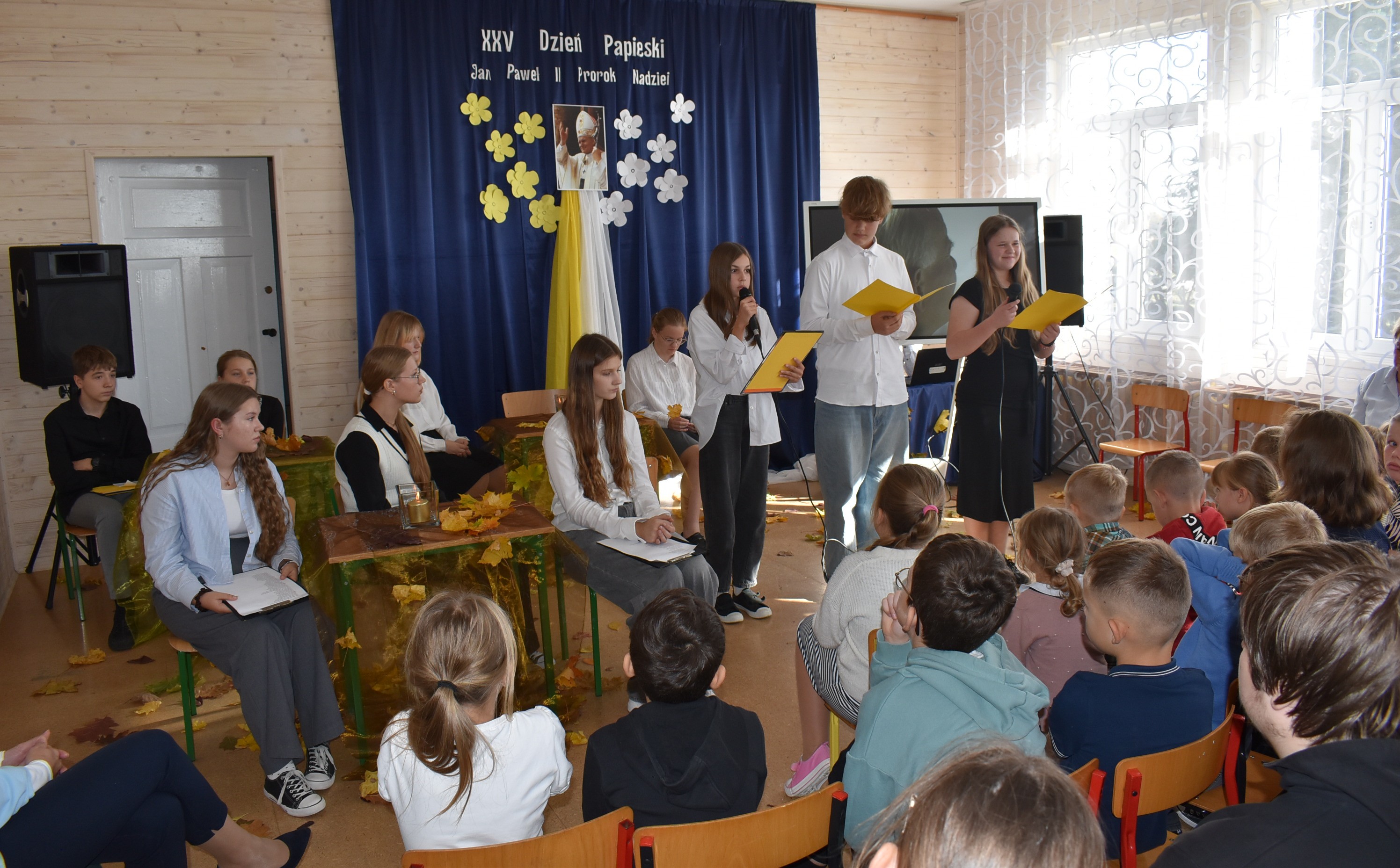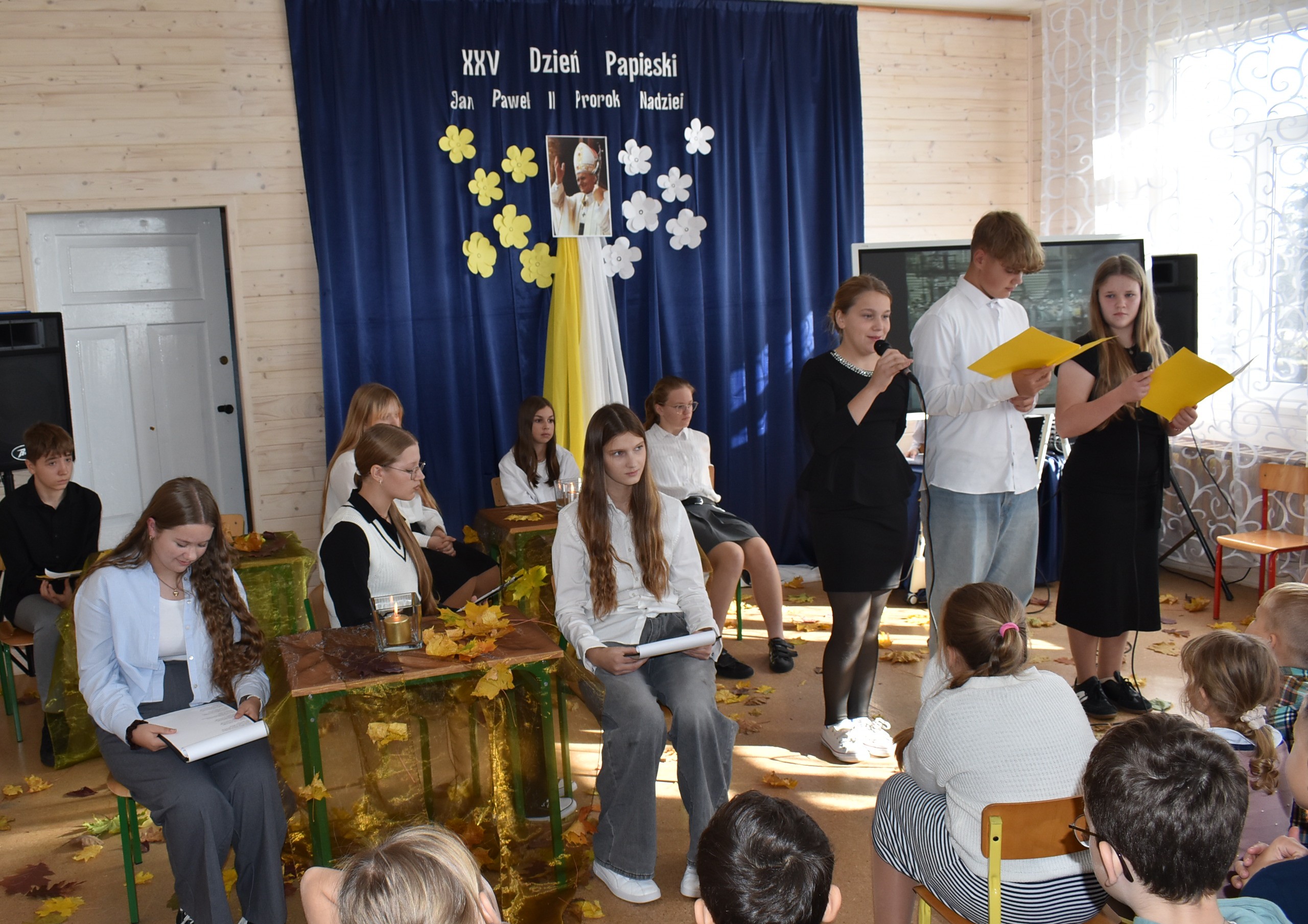 W przygotowanym montażu słowno-muzycznym uczniowie klas VII i VIII zaprezentowali fragmenty z życiorysu Świętego Jana Pawła II, połączone z poezją oraz utworami muzycznymi, oddając przesłaniejego wiary, miłości i nadziei.
