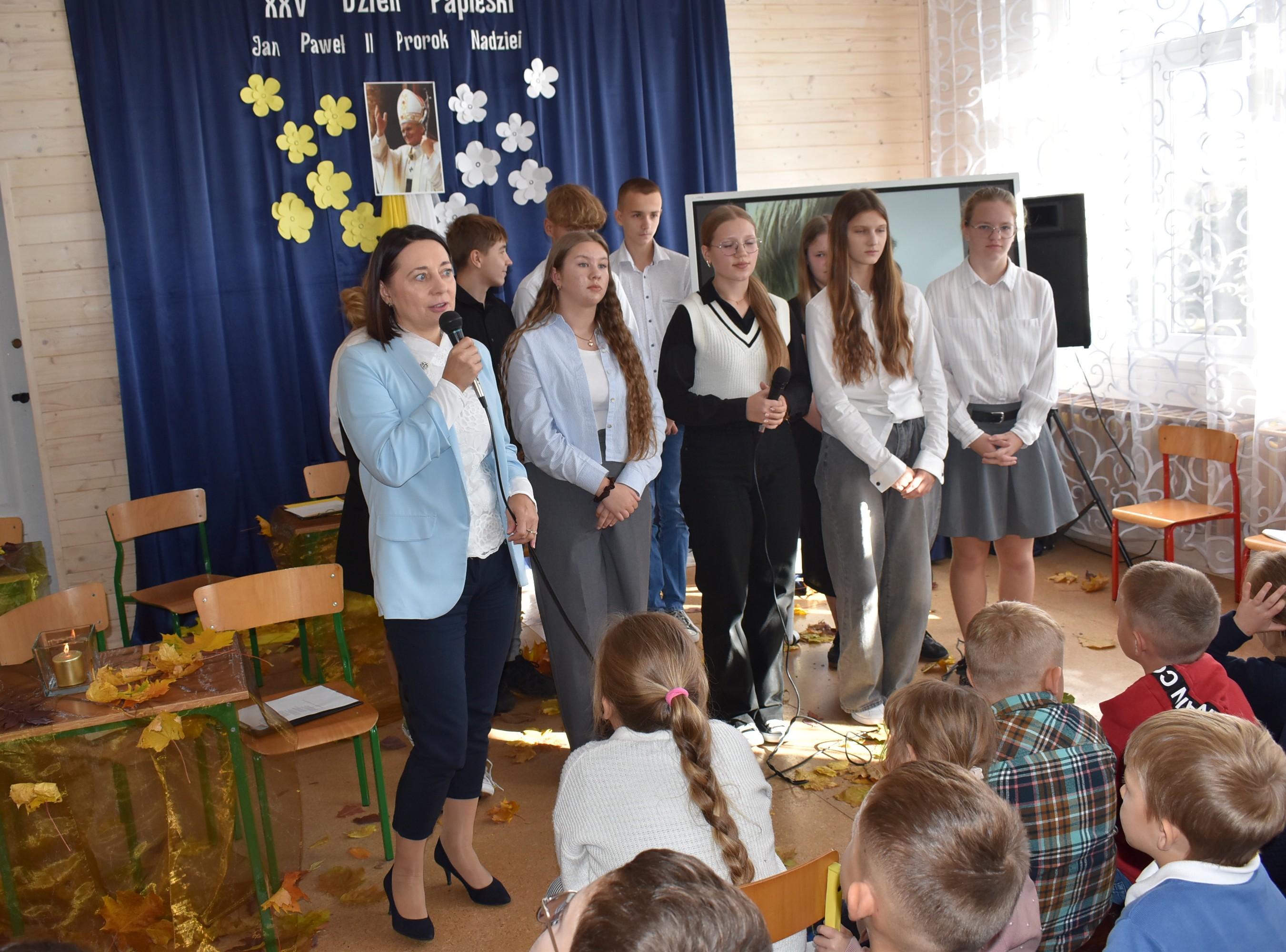 Na zakończenie uroczystości głos zabrała Pani Dyrektor Anna Dziubak, dziękując wszystkim uczestnikom za zaangażowanie i udział w obchodach XXV Dnia Papieskiego. Podkreśliła, jak ważne jest, by wartości głoszone przez Jana Pawła II – miłość, nadzieja, wiara i szacunek dla drugiego człowieka – były obecne w naszym codziennym życiu i nauce, a także inspirowały do czynienia dobra na co dzień.